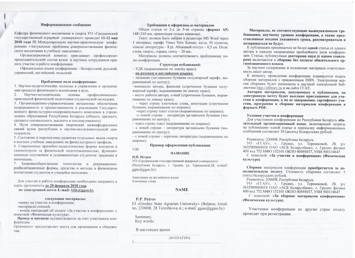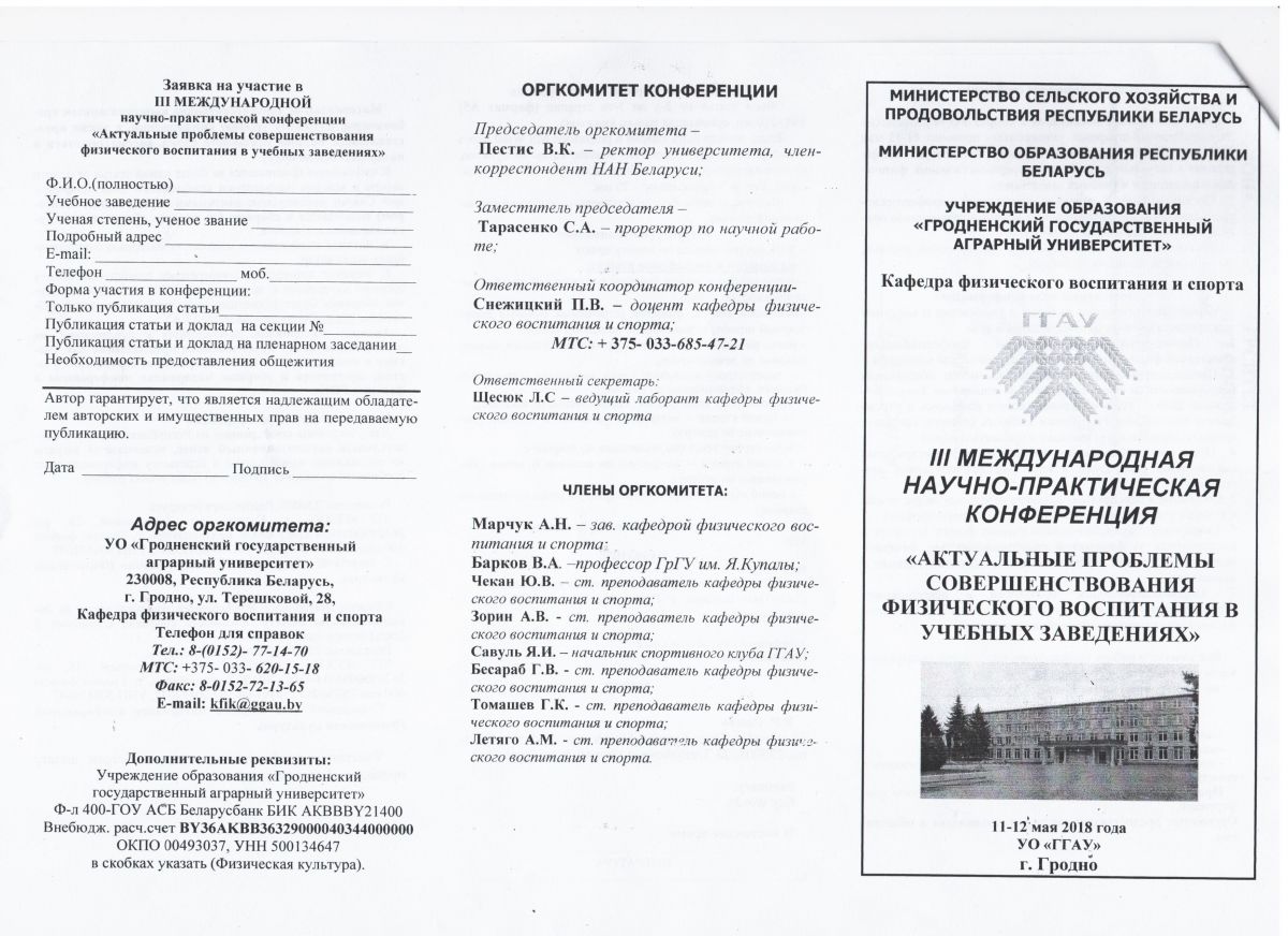 11-12 травня 2018 р. в УО "Гродненський державний аграрний університет" відбудеться ІІІ Міжнародна науково-практична конференція "Актуальні проблеми вдосконалення фізичного виховання в освітніх закладах"