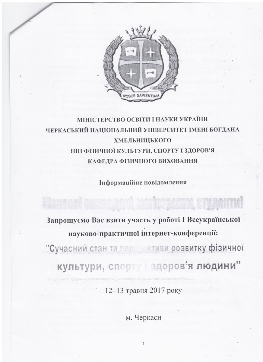 • 12-13 травня 2017 року в Черкаському національному університеті імені Богдана Хмельницького відбудеться І Всеукраїнська науково-практична інтернет конференція "Сучасний стан та перспективи розвитку фізичної культури, спорту і здоров'я людини"