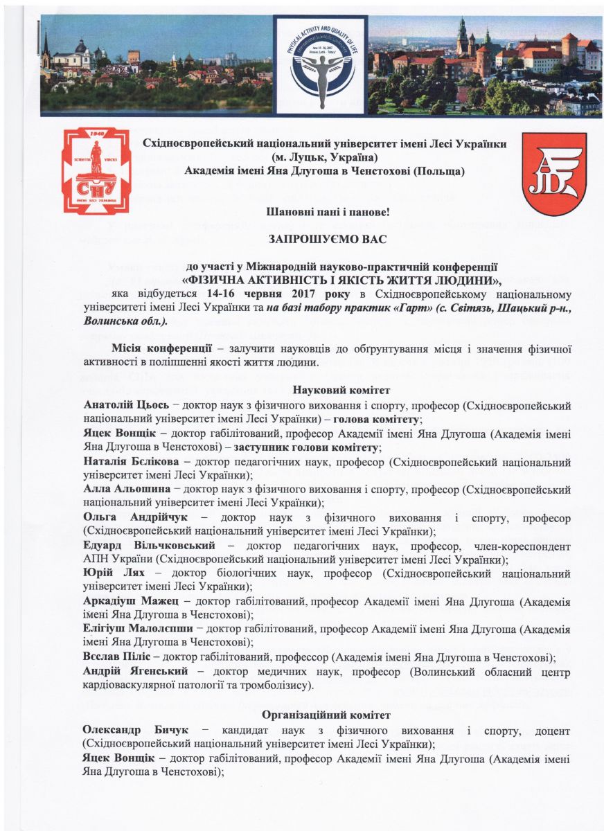 • 14-16 червня 2017 року в Східноєвропейському національному університеті імені Лесі Українки та на базі табору практик "Гарт" відбудеться Міжнародна науково-практична конференція "Фізична активність і якість життя людини"