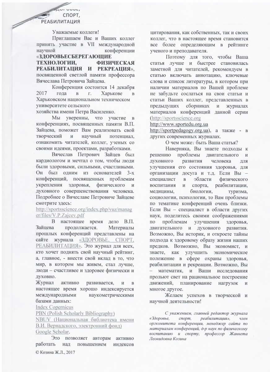 14 грудня 2017 року Харківський національний технічний університет сільського господарства ім. Петра Василенка запрошує Вас взяти участь в VІІ Міжнародній науковій конференції "Здоров'язберігаючі технології, фізична реабілітація і рекреація"