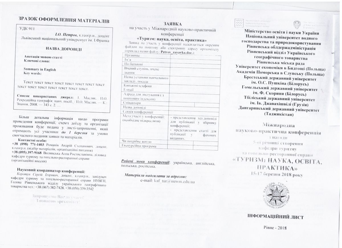 15-17 березня 2018 року Національний університет водного господарства та природокористування (м. Рівне) запрошує Вас взяти участь в роботі Міжнародної науково-практичної конференції "Туризм: наука, освіта, практика"