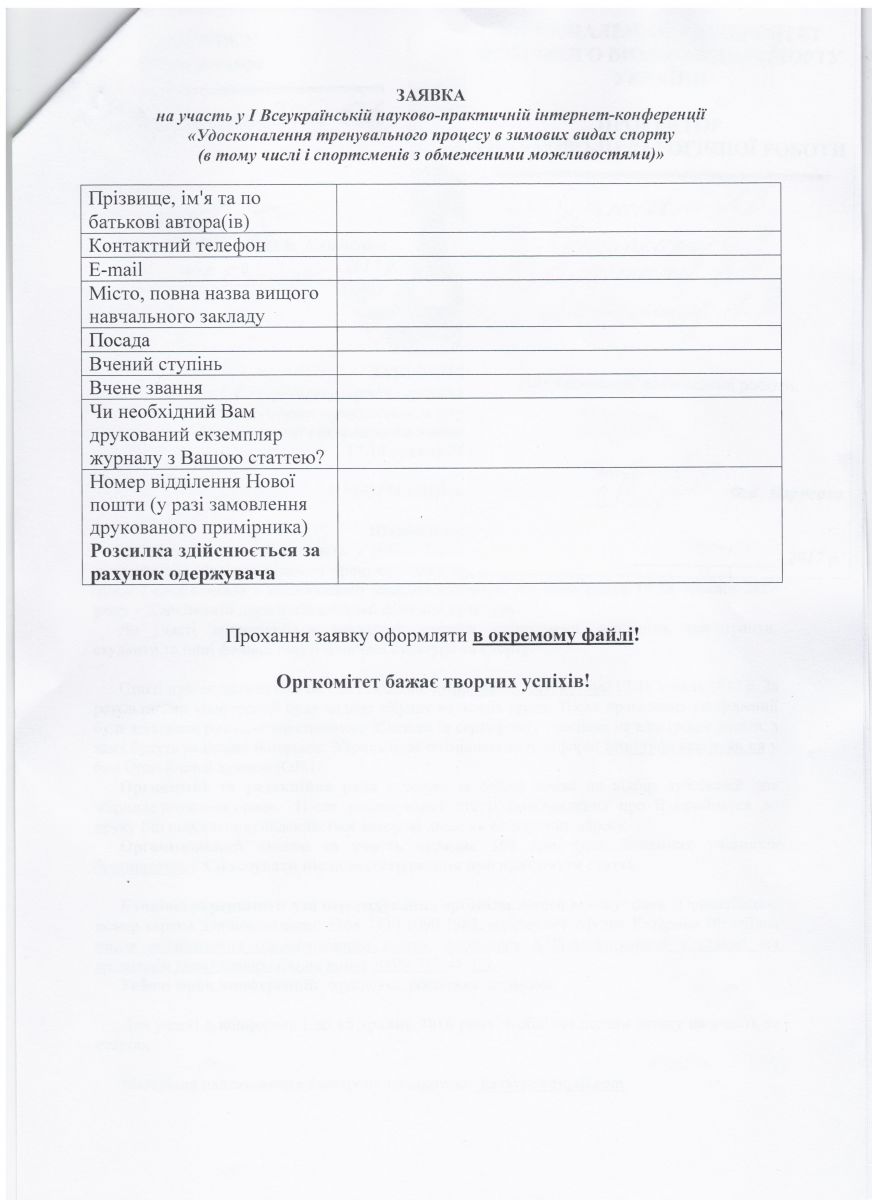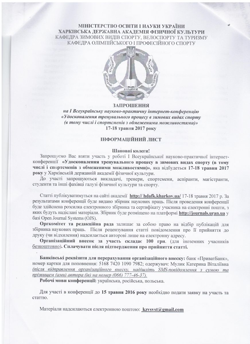 • 17-18 травня 2017 року у Харківській державній академії фізичної культури відбудеться Перша Всеукраїнська науково – практична інтернет конференція “Удосконалення тренувального процесу в зимових видах спорту”