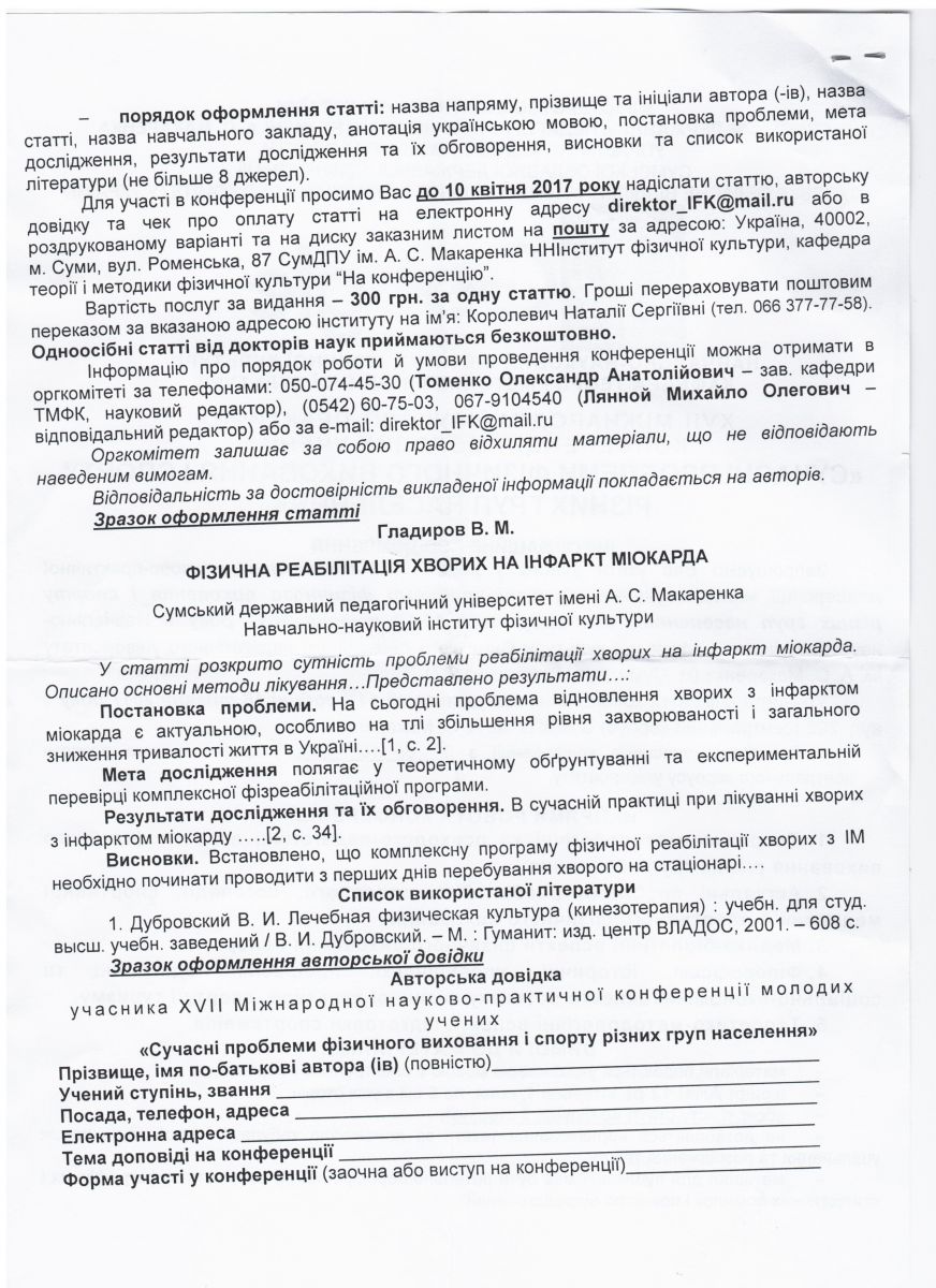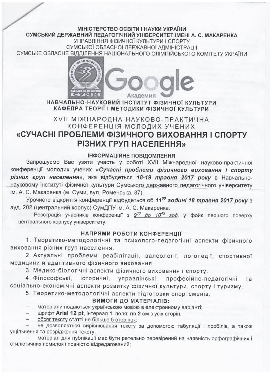 • 18-19 травня 2017 році в Сумському державному педагогічному університеті імені А.С. Макаренка відбудеться ХVІІ Міжнародна науково-практична конференція молодих вчених "Сучасні проблеми фізичного виховання і спорту різних груп населення"