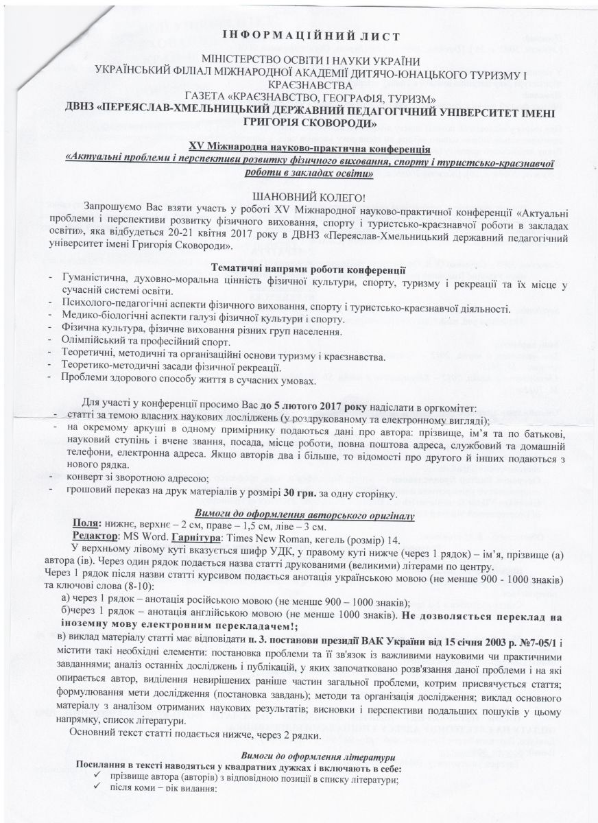 • 20-21 квітня 2017 року в ДВНЗ "Переяслав-Хмельницькому державному педагогічному університеті імені Григорія Сковороди" відбудеться ХV Міжнародна науково-практична конференція "Актуальні проблеми і перспективи розвитку фізичного виховання, спорту і турист