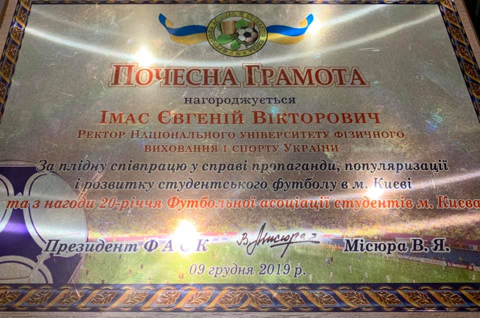 Ректора НУФВСУ Євгенія Імаса нагороджено Почесною грамотою ФАСК за плідну співпрацю у справі пропаганди, популяризації і розвитку студентського футболу у м. Києві