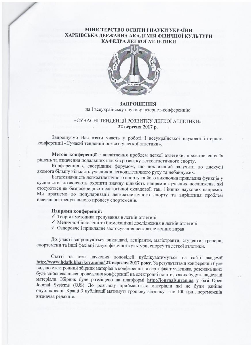 • 22 вересня 2017 року Харківська державна академія фізичної культури запрошує на І всеукраїнську наукову інтернет-конференцію "Сучасні тенденції розвитку легкої атлетики"