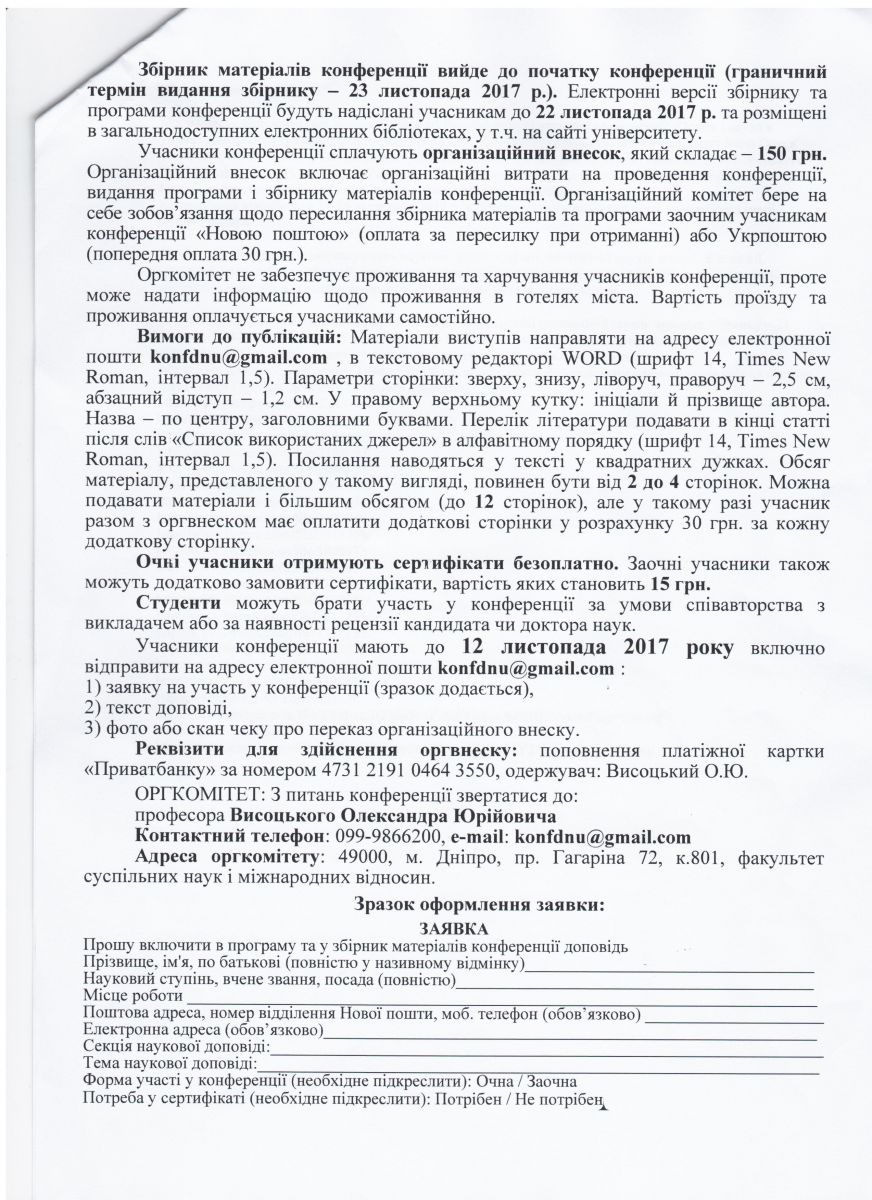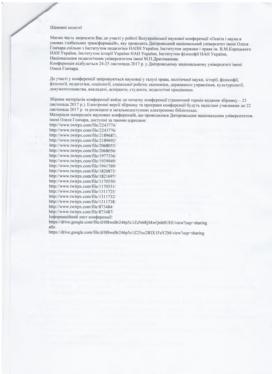 • 24-25 листопада 2017 р. Дніпровський національний університет імені Олеся Гончара запрошує Вас взяти участь у роботі Всеукраїнської наукової конференції "Освіта і наука в умовах глобальних трансформацій"