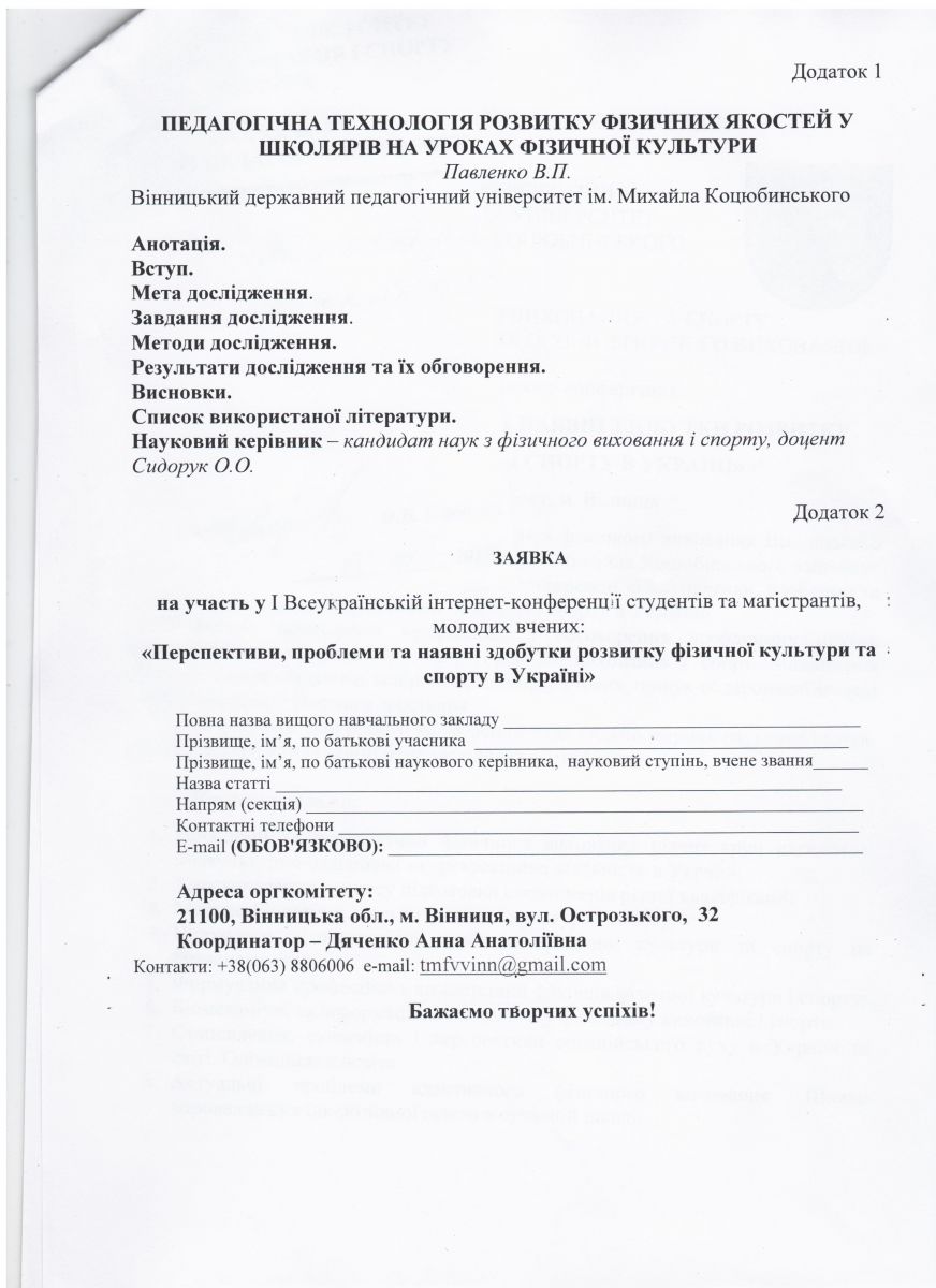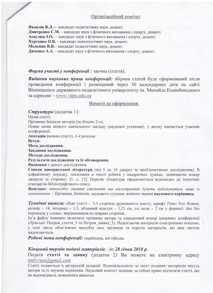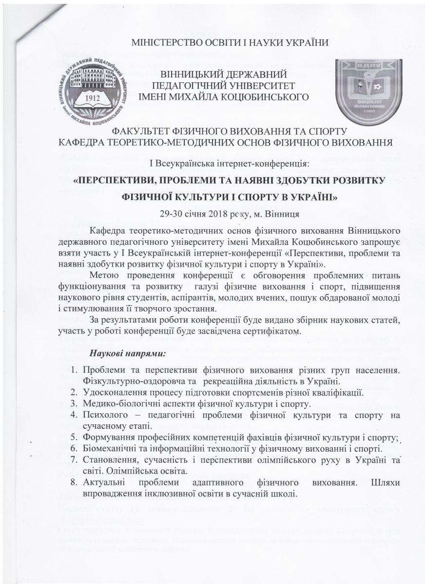 29-30 січня 2018 року Вінницький державний педагогічний університет імені Михайла Коцюбинського запрошує взяти участь у І Всеукраїнській інтернет-конференції "Перспективи, проблеми та наявні здобутки розвитку фізичної культури і спорту в Україні"