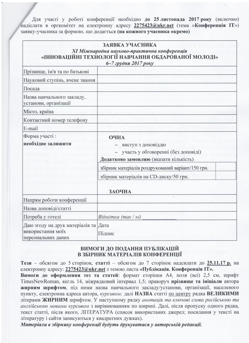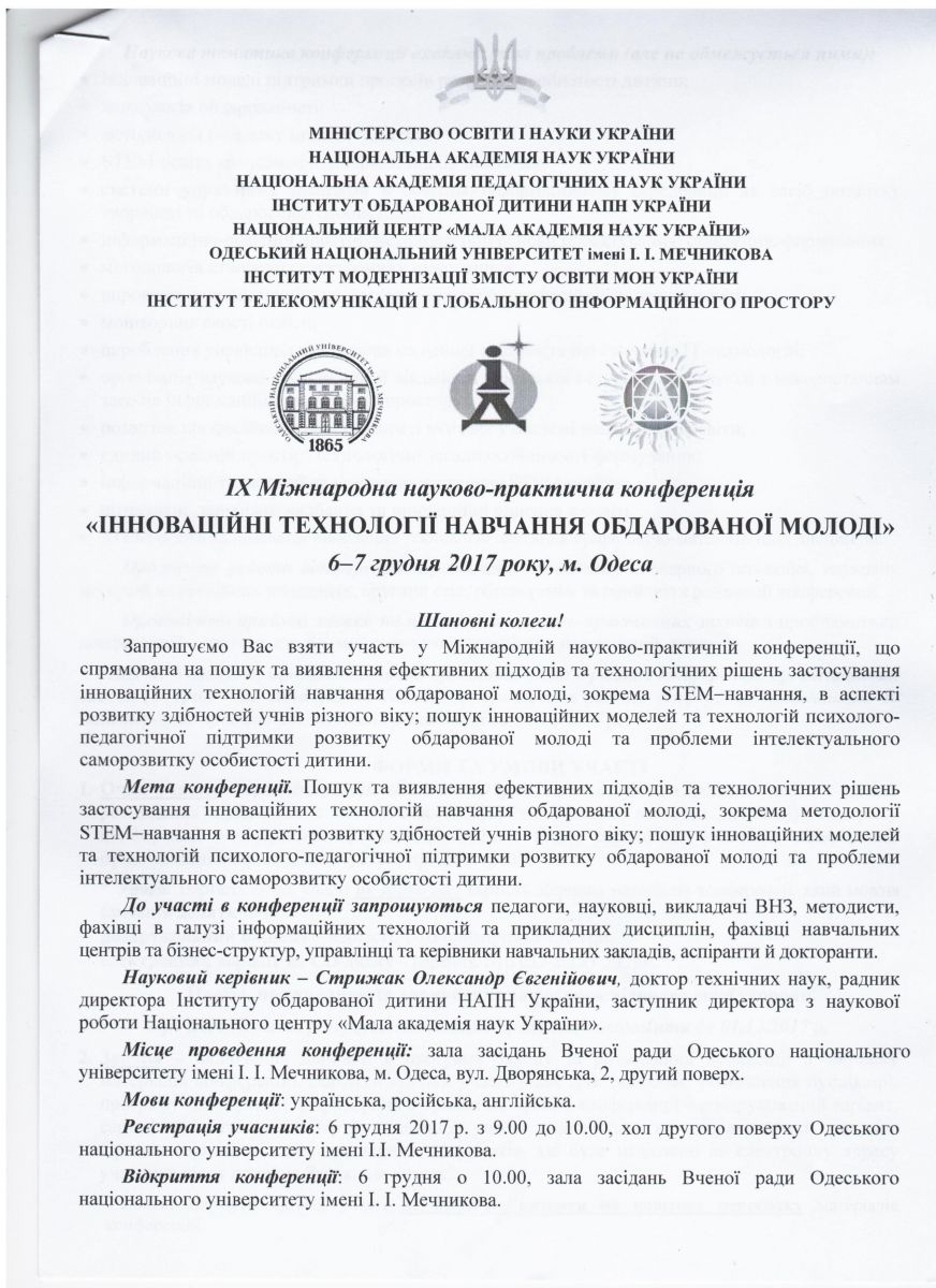 • 6-7- грудня 2017 р. Одеський національний університет імені І.І. Мечнікова запрошує вас взяти участь у ІХ Міжнародній науково-практичній конференції "Інноваційні технології навчання обдарованої молоді"