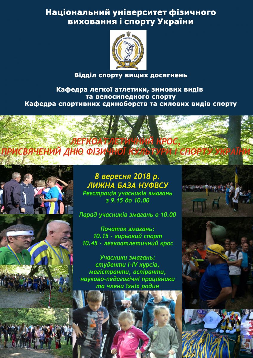 8 вересня (субота) Національним університетом фізичного виховання і спорту України у Національному природному парку «Голосіївський» буде проведено легкоатлетичний крос серед студентів, магістрантів, аспірантів, науково-педагогічних працівників та їх дітей.
