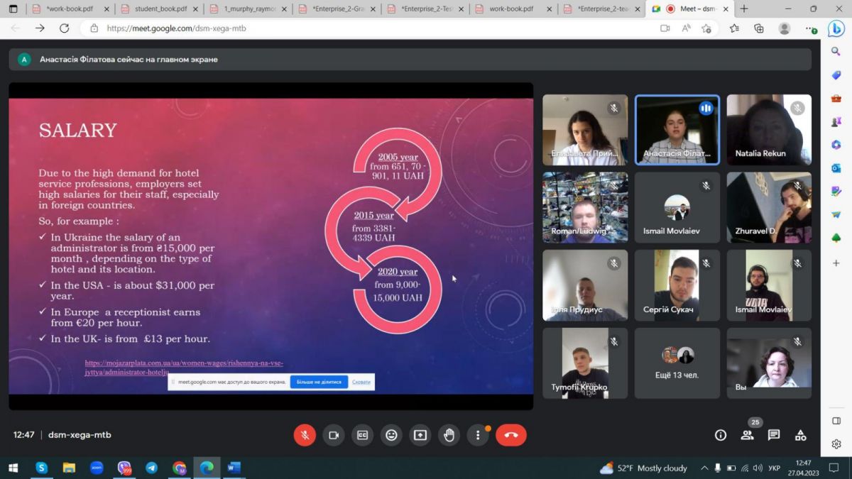 Студентська конференція для здобувачів першого (бакалаврського) та другого (магістерського) рівнів вищої освіти спеціальності 242 Туризм було організовано у формі онлайн конференції, де студенти та викладачі кафедри туризму отримали можливість ознайомитись із доповідями та презентаціями спікерів, написати відгуки у чаті, взяти участь у обговоренні актуальної проблематики вибору професії в туризмі. Cвої творчі доробки у формі наукових доповідей представили студентки групи 23ТР1 – Приймак Єлизавета та Філатова Анастасія, студенти групи 33ТР1 – Вебер Роман, Прудиус Ілля, Якобчук Юлія, студенти групи 1МЗТР1 – Замчалов Микола та Вакуленко Олександра.