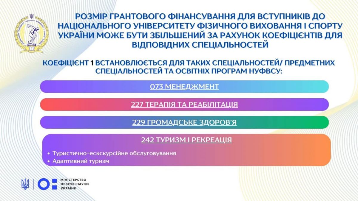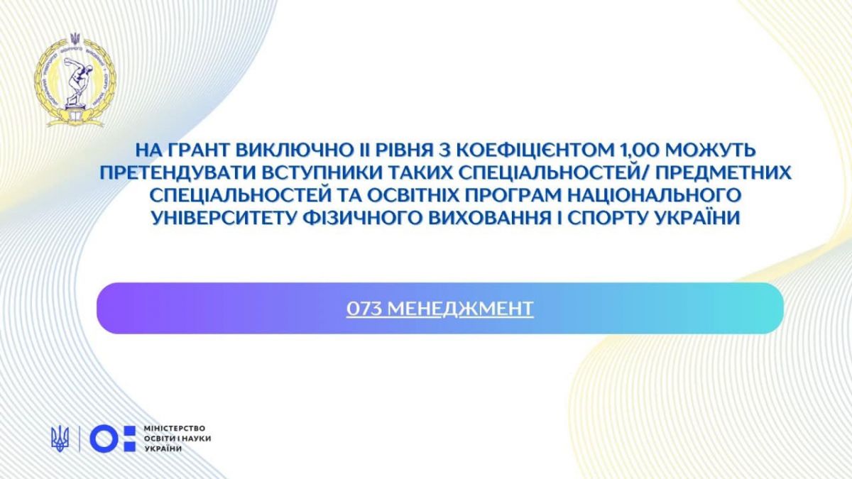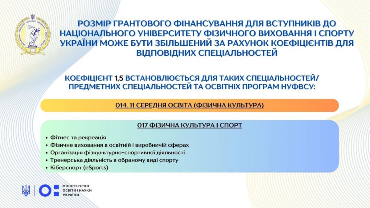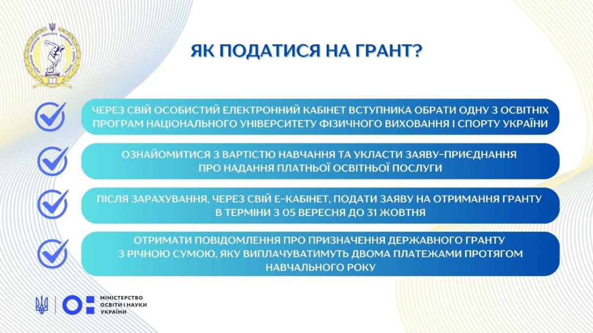 Національний університет фізичного виховання і спорту України долучається до реалізації експериментального проєкту Міністерства освіти і науки України щодо надання державних грантів для здобувачів вищої освіти у 2024 році.