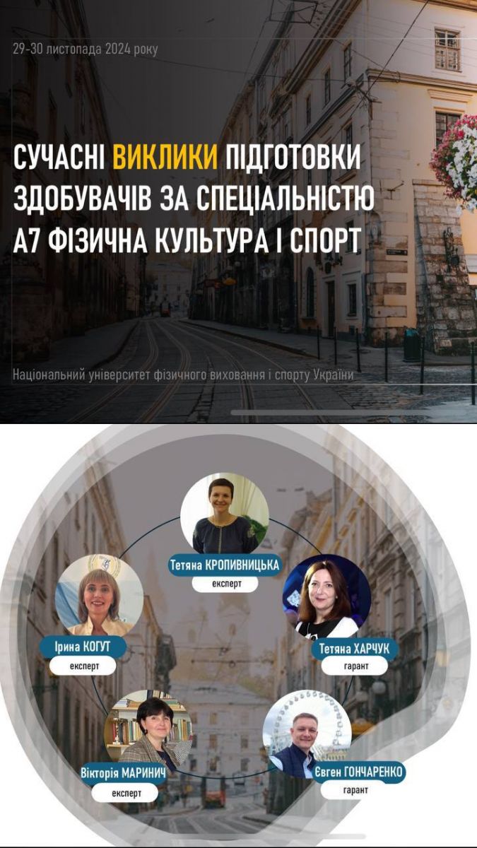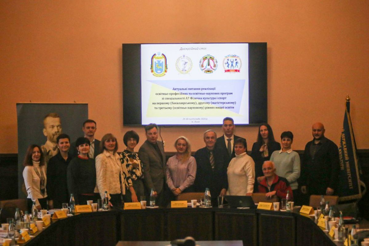 Науково-методичний захід на тему «Актуальні питання реалізації освітньо-професійних та освітньо-наукових програм зі спеціальності А7 Фізична культура і спорт” на першому (бакалаврському), другому (магістерському) та третьому (освітньо-науковому) рівнях вищої освіти» відбувся 29-30 листопада у Львові. Подія об’єднала фахівців галузевих закладів вищої освіти України, серед яких були представники НУФВСУ, Львівського державного університету фізичної культури імені Івана Боберського, Харківської державної академії фізичної культури та Придніпровської академії фізичної культури і спорту.