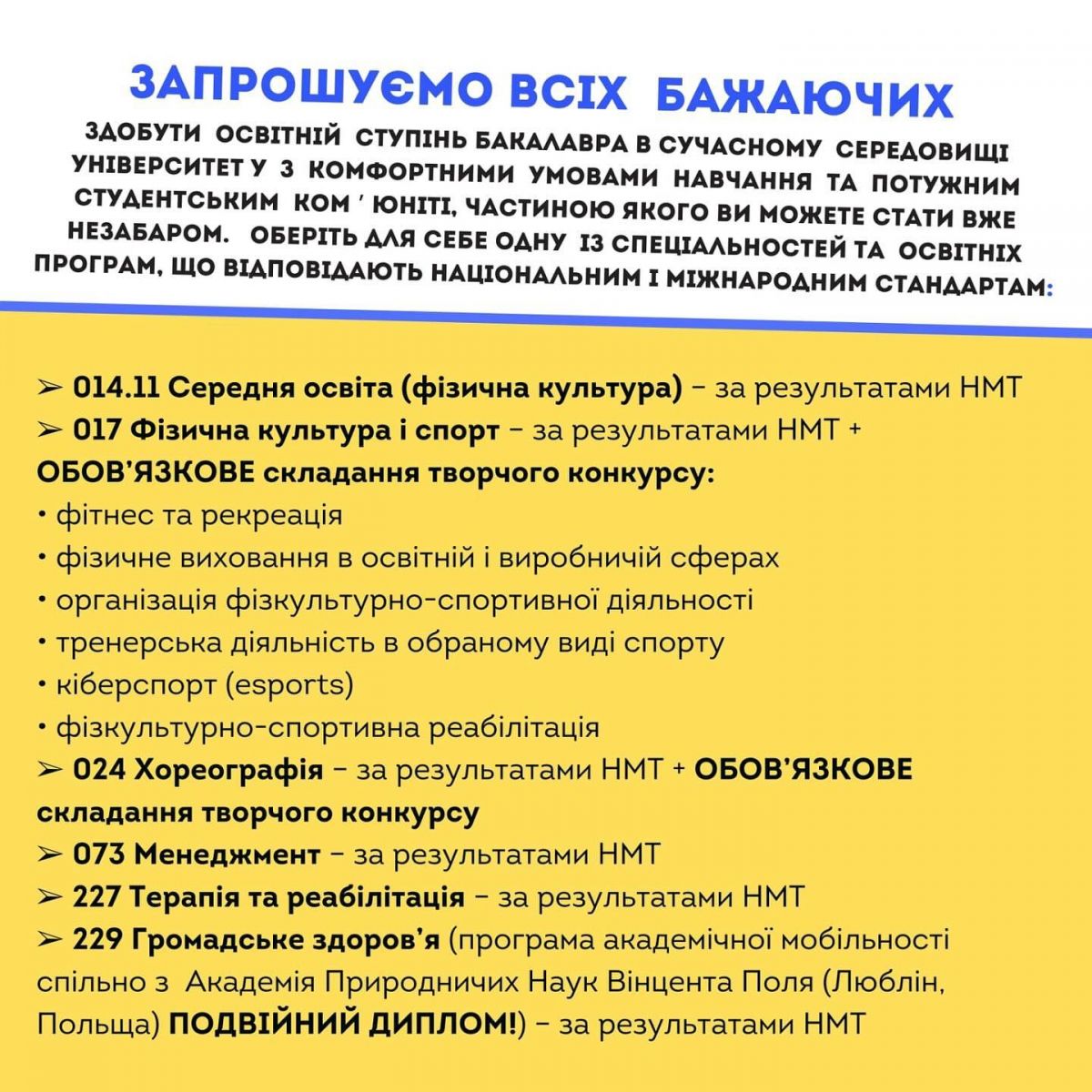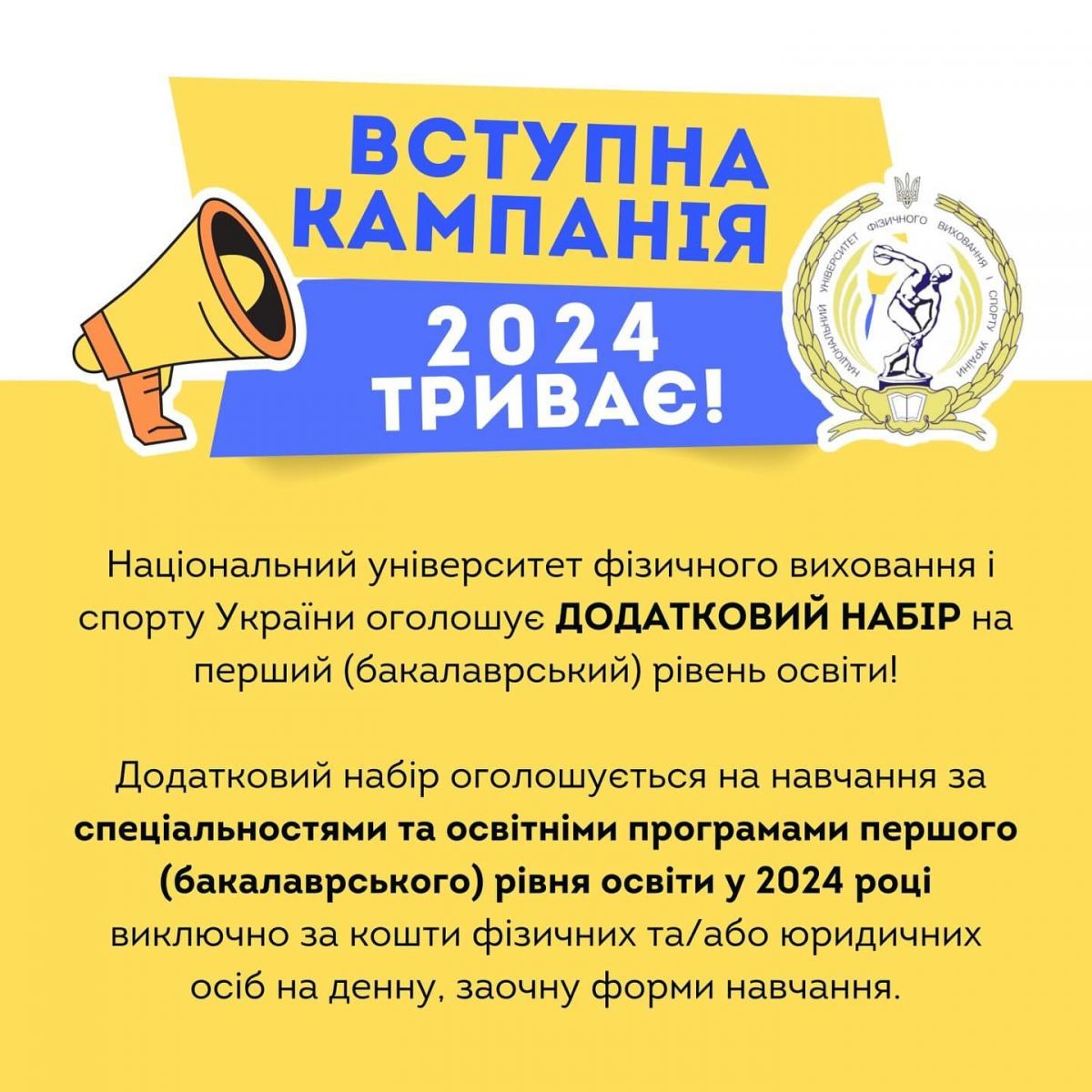 Національний університет фізичного виховання і спорту України оголошує ДОДАТКОВИЙ НАБІР за освітнім ступенем БАКАЛАВРА!