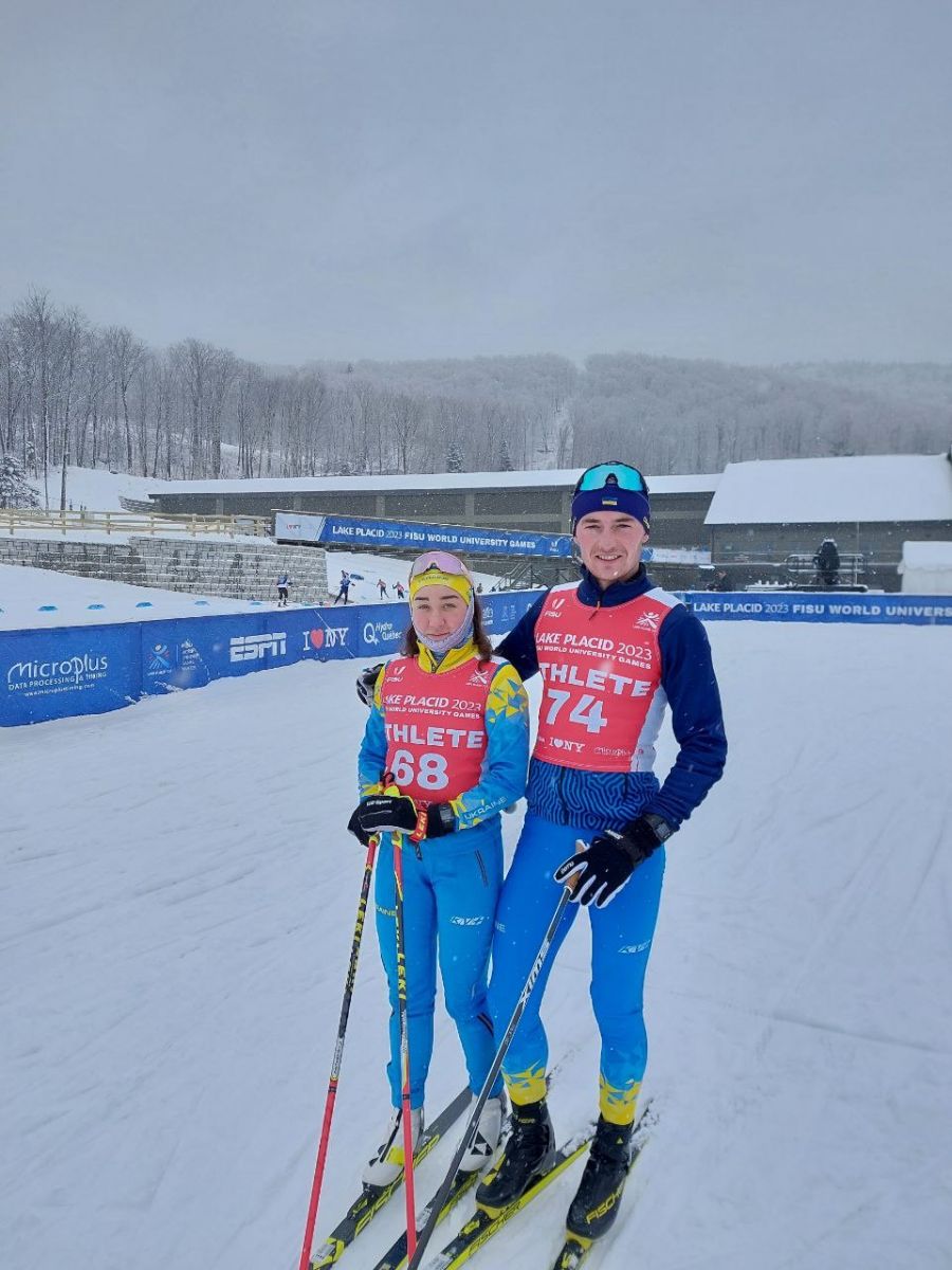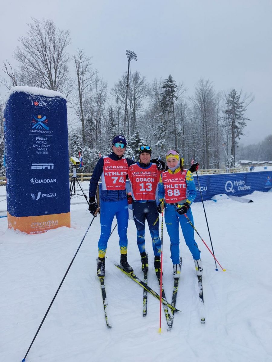На фото – наші студенти Настя Савінська та Максим Бондар разом із тренером збірної України з лижних гонок, старшим викладачем кафедри легкої атлетики,зимових видів на велосипедного спорту Дмитром Хуртиком!
