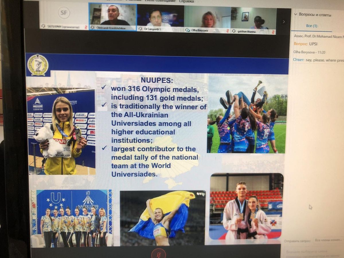 Україну із пленарною доповіддю "National University of Ukraine on Physical Education and Sport: achivements and activities" репрезентувала проректор з науково-педагогічної роботи, професор ОЛЬГА БОРИСОВА. Ольга Володимирівна представила презентацію за темою, а потім учасники мали змогу ознайомитись із коротким відео про Київ. Проректор у своїй доповіді висвітлила усі ключові моменти роботи НУФВСУ, досягнення та наукові здобутки.