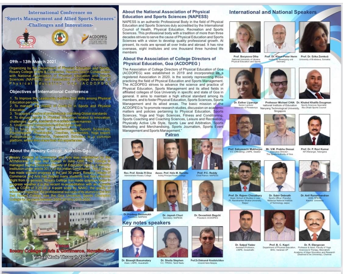 Організаторами заходу виступили Департамент фізичного виховання та спорту Коледжу мистецтв та торгівлі Розарі (Navelim-Goa, Індія) у співпраці із Національною асоціацією фізичного виховання та спорту (NAPESS) та Асоціацією директорів коледжів фізичного виховання ГОА (ACDOPEG).