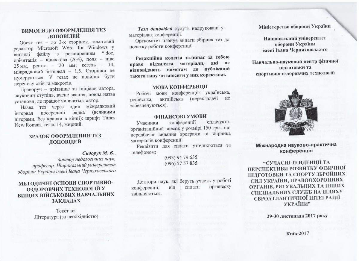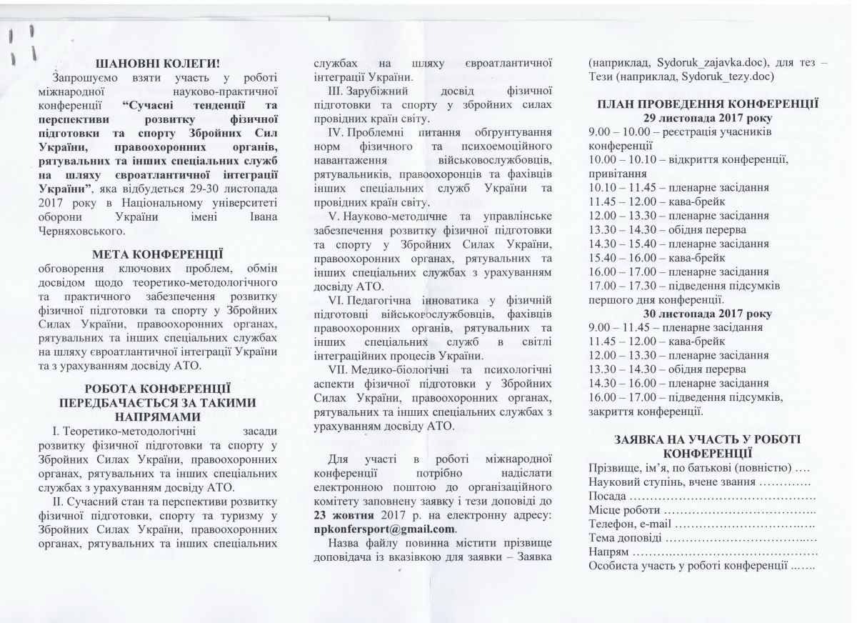 29-30 листопада 2017 року в Національному університеті оборони України імені Івана Черняховського запрошує до участі у Міжнародній науково-практичній конференції "Сучасні тенденції та перспективи розвитку фізичної підготовки та спорту Збройних Сил України, правоохоронних органів, рятувальних та інших спеціальних служб на шляху євроатлантичної інтеграції України"