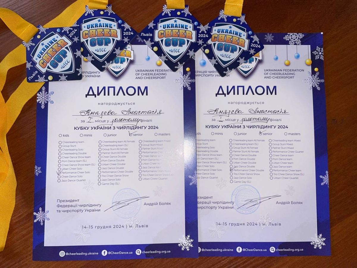 Першокурсниця кафедри оздоровчо-рекреаційної рухової активності Анастасія КНЯЗЄВА зібрала колекцію золотих нагород цьогорічного Кубку України з чирлідингу, що проходив з 14 по 15 листопада у Львові!