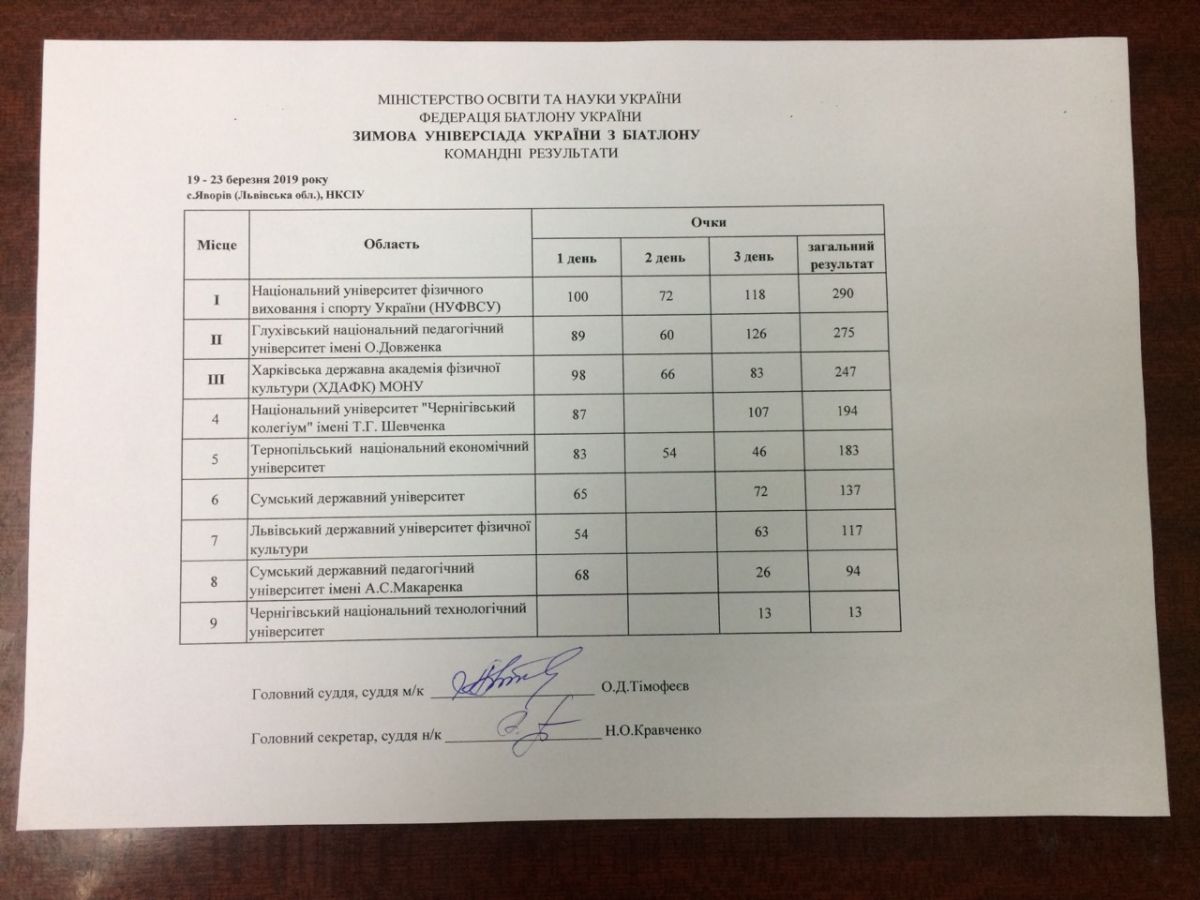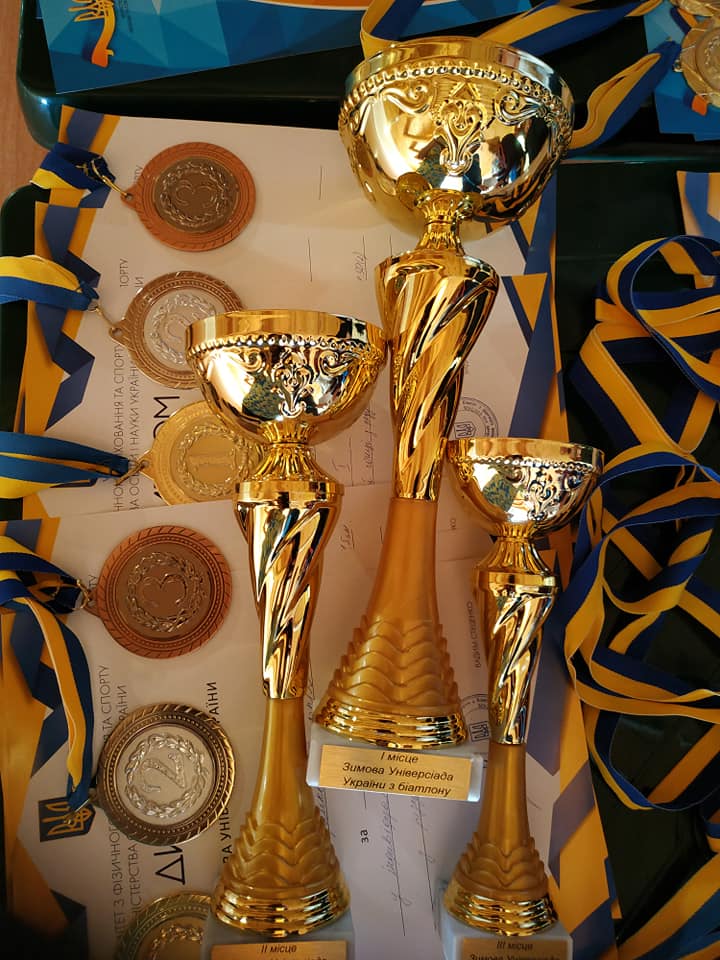 Національний університет фізичного виховання і спорту України вітає студентів кафедри легкої атлетики, зимових видів та велосипедного спорту, які в складі збірної команди університету здобули перше загальнокомандне місцем на Зимовій Універсіаді України з біатлону серед закладів вищої освіти з результатом 290 очок, що проходила 19-23 березня 2019 року на базі Західного реабілітаційно-спортивного центру НКСІУ, с. Яворів, Львівська область.