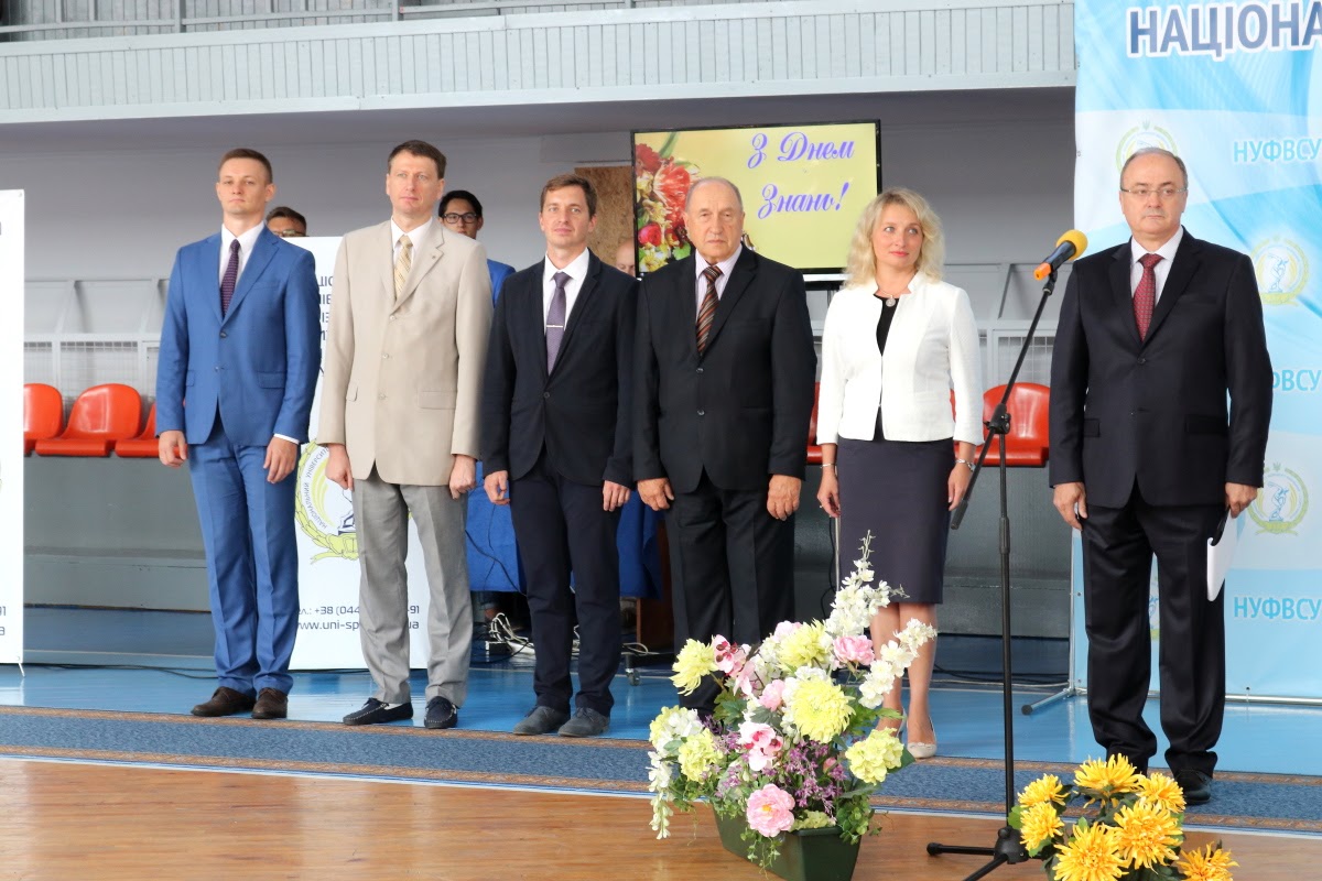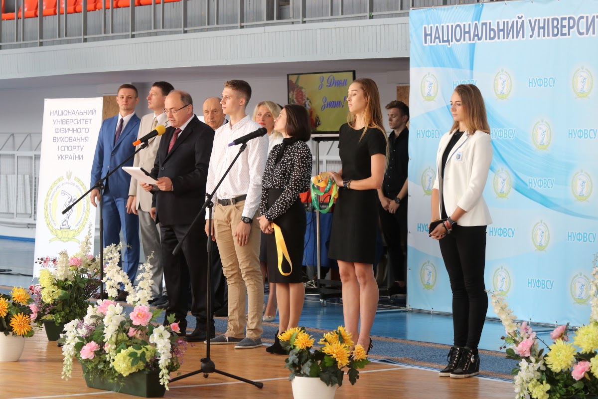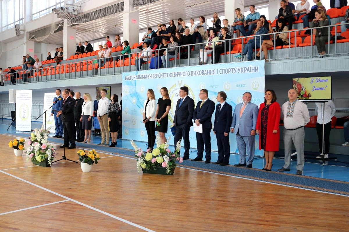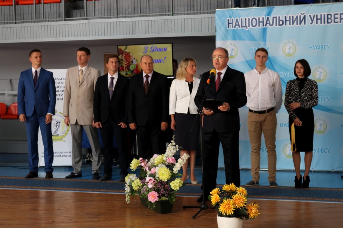 Вітання з нагоди початку нового 2017/2018 навчального року та Дня знань від Президента України передав Керівник Апарату Адміністрації Президента України, голова Наглядової ради університету Олексій Сергійович ДНІПРОВ. Привітав студентів Міністр молоді та спорту України Ігор Олександрович ЖДАНОВ. Успіхів у новому навчальному році побажав академік-секретар Відділення вищої освіти Національної академії педагогічних наук України, професор Петро Юрійович САУХ. Ректор університету, професор Євгеній Вікторович ІМАС привітав усіх присутніх із Днем знань, побажавши нових вершин у спорті та навчанні.