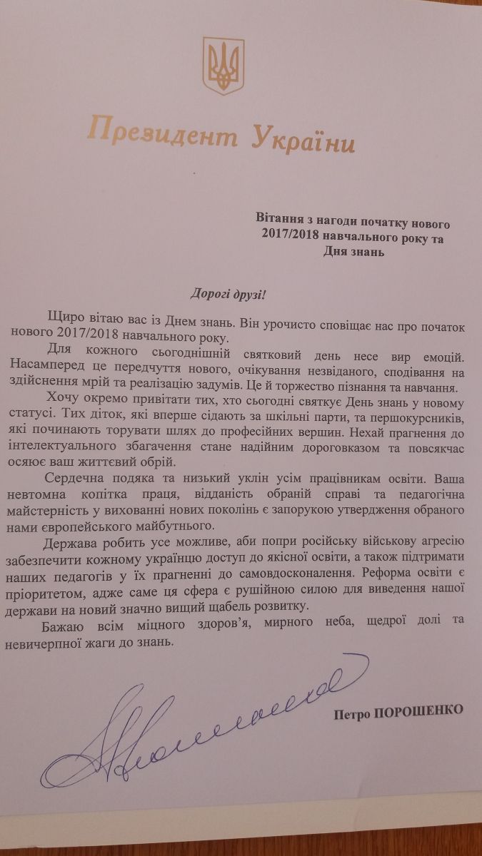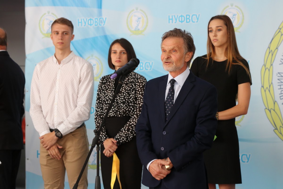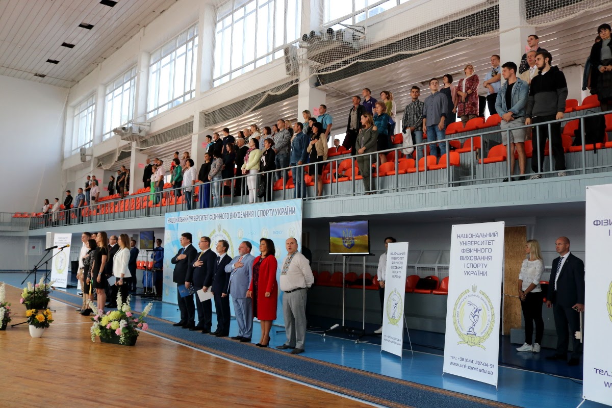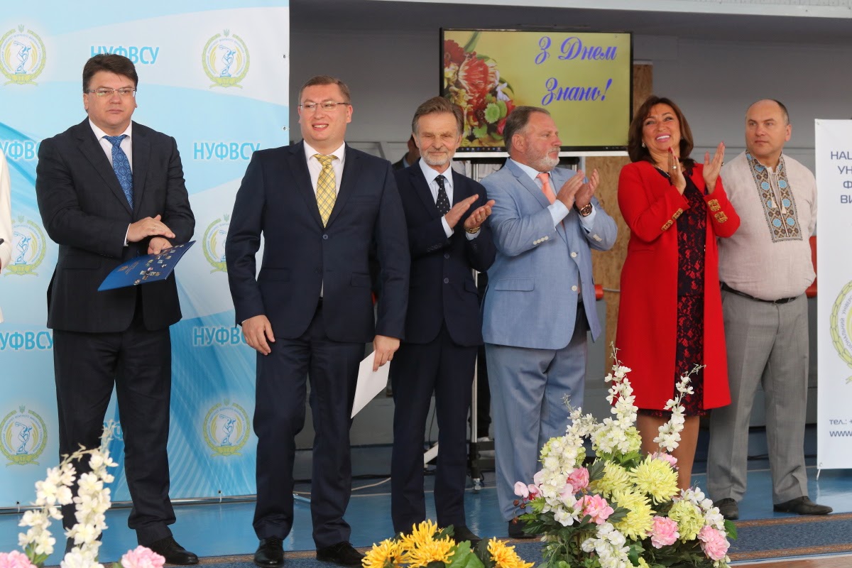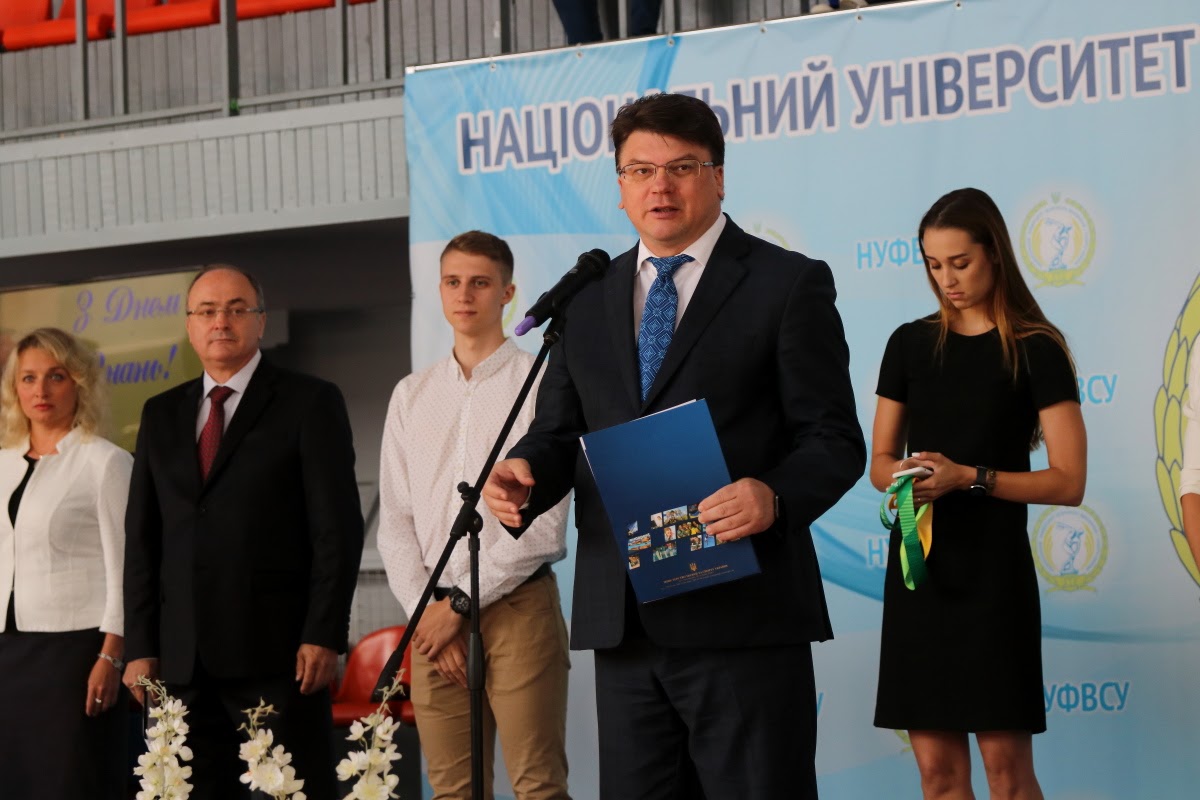 Вітання з нагоди початку нового 2017/2018 навчального року та Дня знань від Президента України передав Керівник Апарату Адміністрації Президента України, голова Наглядової ради університету Олексій Сергійович ДНІПРОВ. Привітав студентів Міністр молоді та спорту України Ігор Олександрович ЖДАНОВ. Успіхів у новому навчальному році побажав академік-секретар Відділення вищої освіти Національної академії педагогічних наук України, професор Петро Юрійович САУХ. Ректор університету, професор Євгеній Вікторович ІМАС привітав усіх присутніх із Днем знань, побажавши нових вершин у спорті та навчанні.