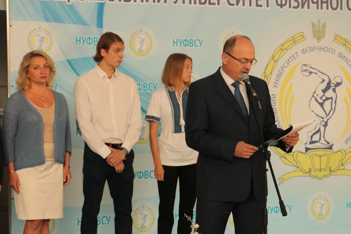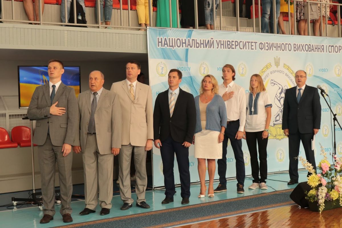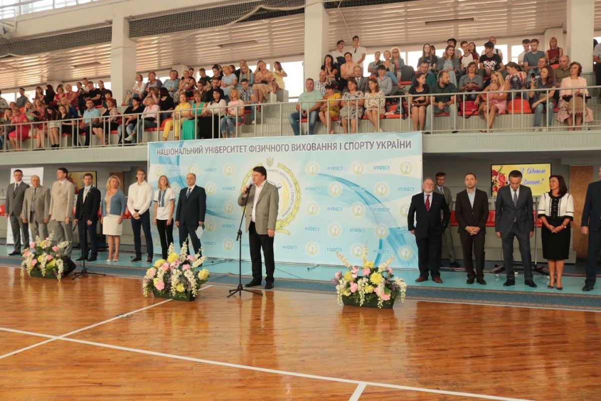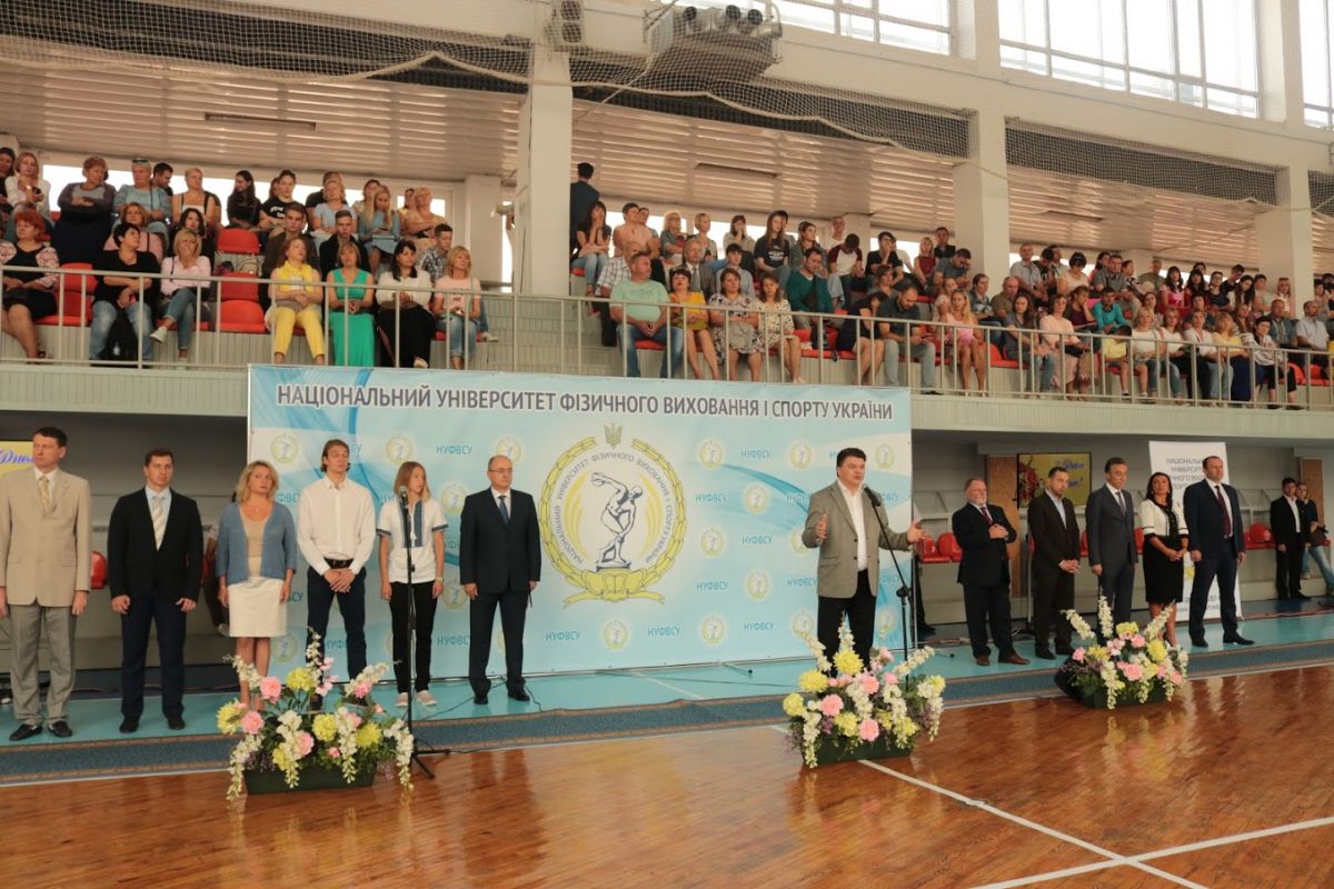 Ведучим церемонії став перший проректор з науково-педагогічної роботи, професор ДУТЧАК Мирослав Васильович, який привітав новобранців із високим званням студента Національного університету фізичного виховання і спорту України.  Мирослав Васильович розповів широкому загалу, що наш університет має понад 88-річну історію й поправу вважається флагманом у сфері вищої галузевої освіти. За цей час підготовлено понад 30 тисяч спортивних тренерів, вчителів фізичного виховання, фахівців з фізичної реабілітації, фізичної терапії, ерготерапії, спортивних менеджерів, фахівців з фітнесу і рекреації, туризму. Наші випускники успішно працюють у вітчизняних і зарубіжних клубах, інших закладах. Проректор із приємністю відзначив, що студенти нашого університету є незмінними переможцями Всеукраїнських студентських олімпіад з фахових дисциплін та конкурсів наукових робіт з фізичного виховання і спорту, фізичної реабілітації. Перший проректор зауважив, що специфіка вишу обумовлює велику увагу до спортивної роботи: наші студенти та випускники завоювали 299 олімпійських нагород, серед яких 113 золотих медалей, зазначив і той факт, що університет традиційно є переможцем Всеукраїнської універсіади серед усіх закладів вищої освіти. Студенти університету роблять найбільший внесок у медальну скарбничку національної збірної команди на Всесвітніх Універсіадах. Україна уже впродовж 25 років входить в десятку кращих націй світу за підсумками літніх Всесвітніх Універсіад.