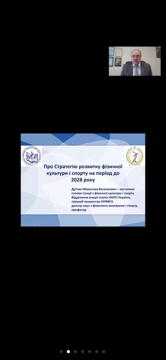 «Стратегію розвитку фізичної культури і спорту на період до 2028 року» висвітлив у своєму виступі заступник Голови Секції, перший проректор з науково-педагогічної роботи Національного університету фізичного виховання і спорту України Дутчак М.В.