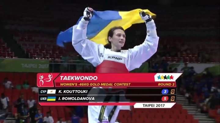 Золоту медаль з тхеквондо на 29-й Всесвітній літній Універсіаді у боротьбі із представницею Кіпру та з рахунком 5:3 виборола наша студентка факультету спорту та менеджменту Ромолданова Ірина!