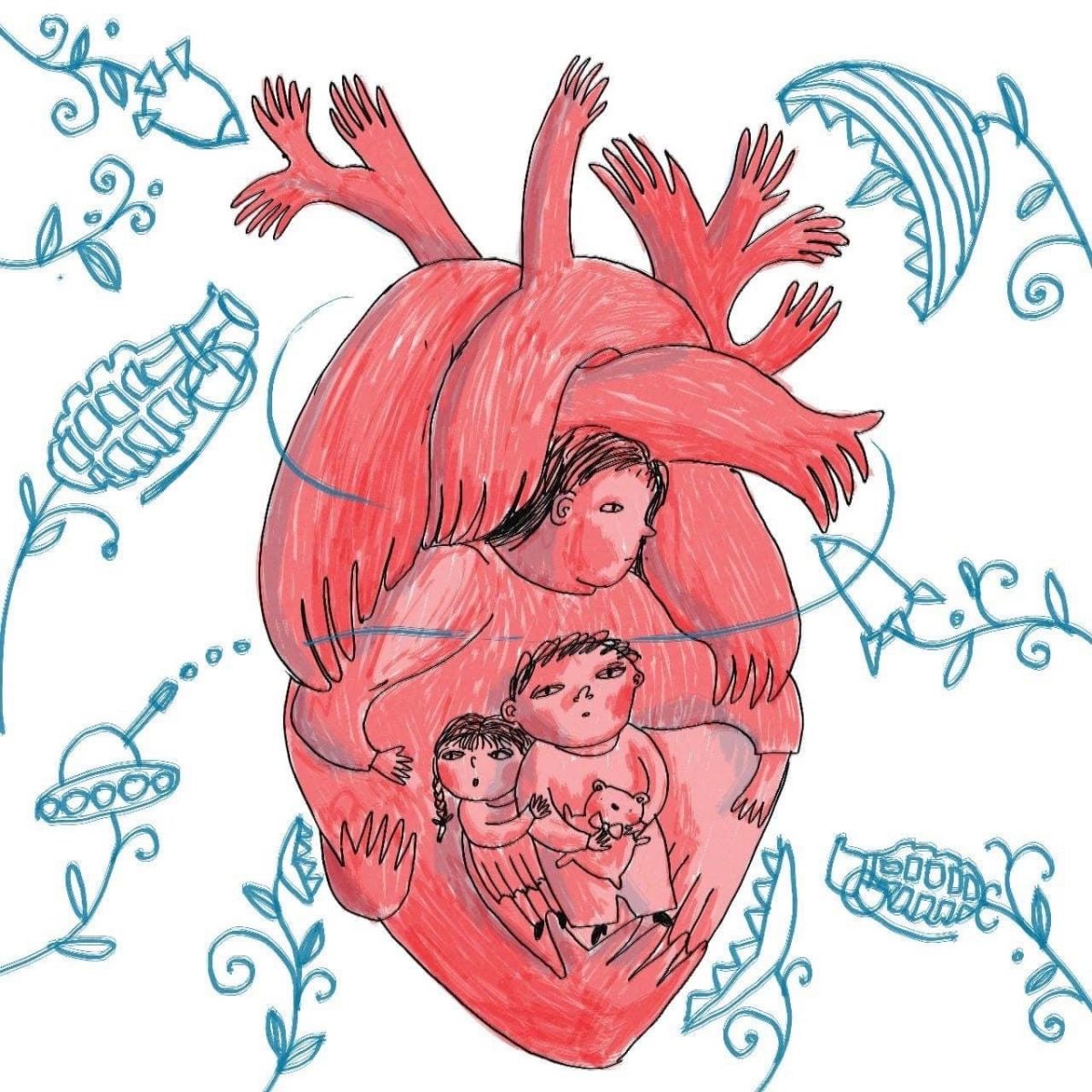 Ілюстрація Надії Кушнір, малюнок тим, хто допомагає сім’ям, вимушеним перебувати в укриттях, лишати рідні домівки під час евакуацій, а також виїжджати за кордон.