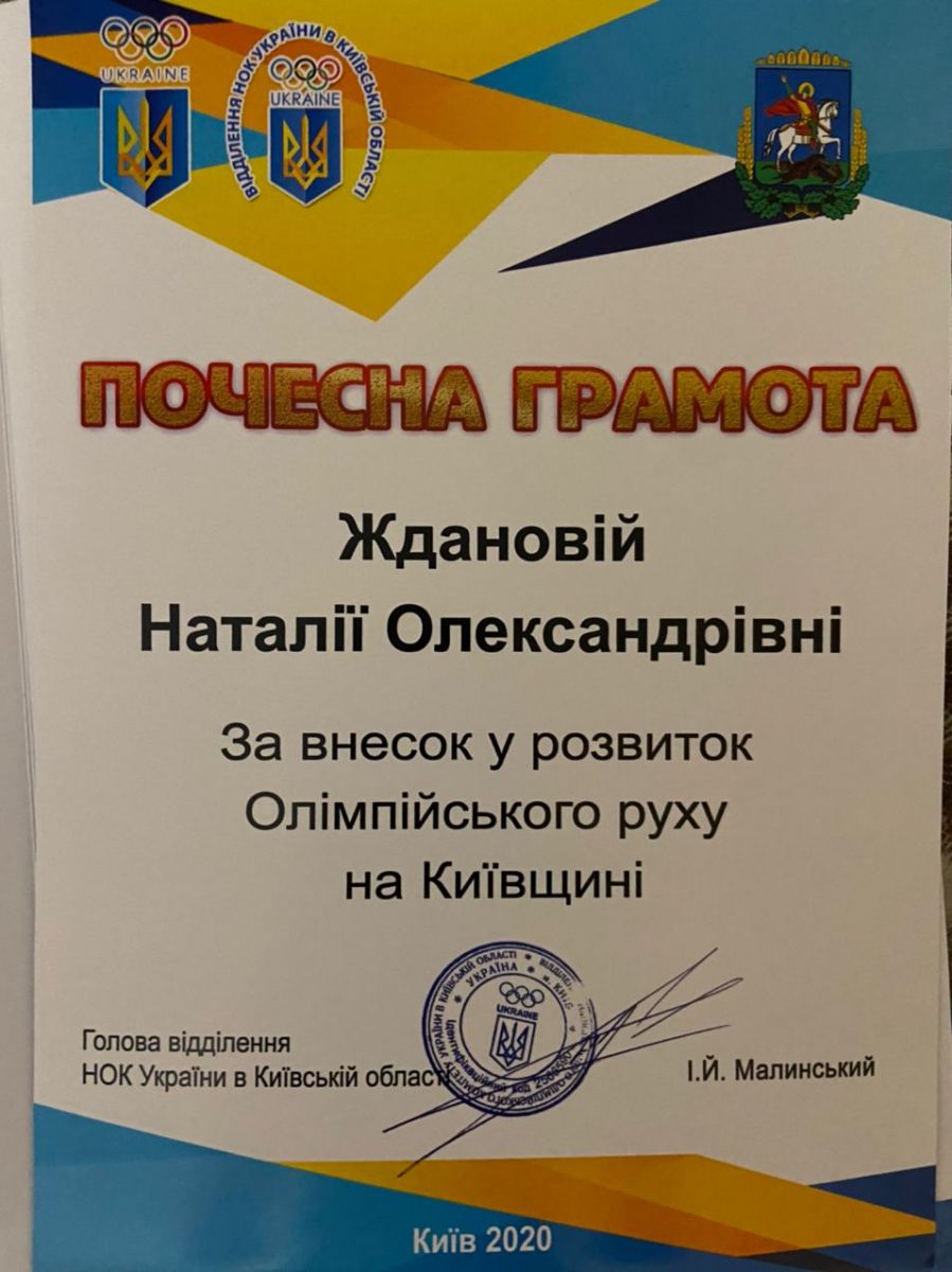 Вітаємо студентку кафедри спортивних ігор Жданову Наталію Олександрівну (4 курс, група 41-СІ2), яка була нагороджена Почесною Грамотою відділенням НОК у Київській області «за внесок у розвиток Олімпійського руху на Київщині».