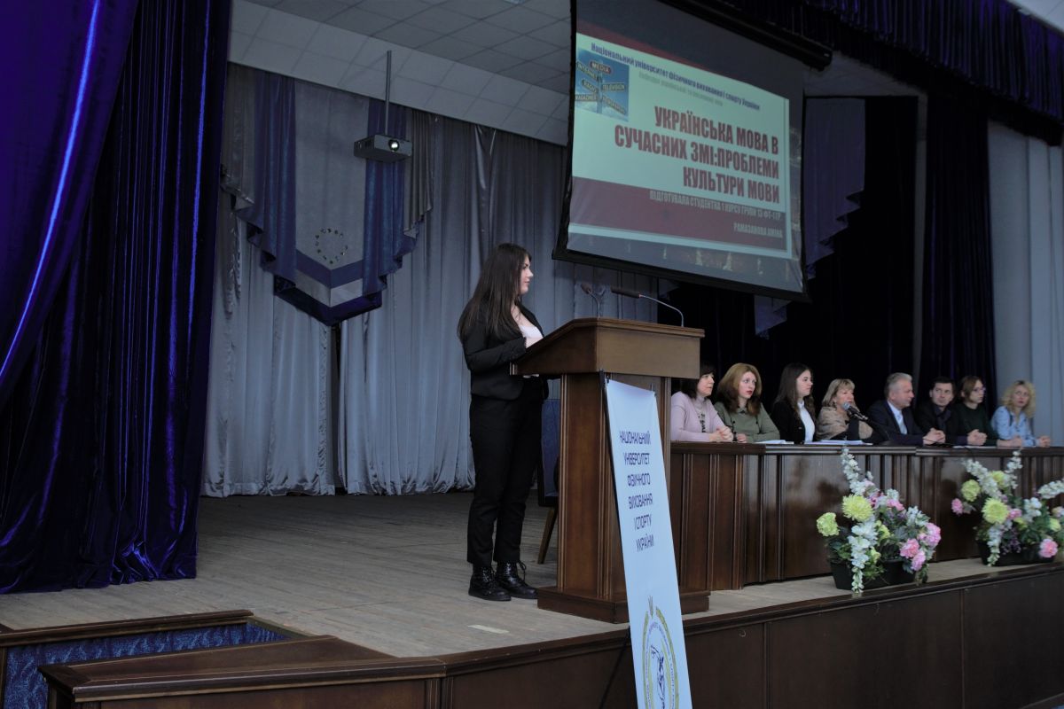 На конференції були присутні почесні гості – декан факультету здоров'я, фізичного виховання та туризму, доцент Литвиненко Ю.В., заступник декана тренерського факультету, доц. Шльонська О.Л., заступник декана факультету спорту та менеджменту, доц. Русанова О.М., завідувач бібліотеки Полтавець Т.М. З науковими доповідями, присвяченими питанням розвитку та функціонування української мови, виступили студенти 1 курсу Рамазанова Аміна (гр. 13-ФТ1, «Українська мова в сучасних ЗМІ: проблеми культури мови»), Конотопенко Олександр (гр. 13-ФТ1, «Мовна поведінка особистості в ситуації білінгвізму»), Зінчук Євген (гр. 12-МЕ1, «Поліський діалект»), Кочерга Софія (гр. 11-ФТ5, «Славетний атлет – Іван Піддубний»), Чайковська Анастасія (гр. 13-ФТ2, «Суржик: ознака неосвіченості чи людської недбалості?»), Москальченко Анастасія (гр. 13-ХТ2, «Бальні танці у спорті»), Трало Федір (гр. 11-СГ, «Паркур»), Данильченко Антон (гр. 12-МЕ1, «Юрій Кульчицький»). Виголошення доповідей супроводжувалось презентаційним наочним матеріалом у вигляді слайдів, відео- та аудіозаписів. Кожному доповідачу присутні ставили запитання і зацікавлено обговорювали доповіді.