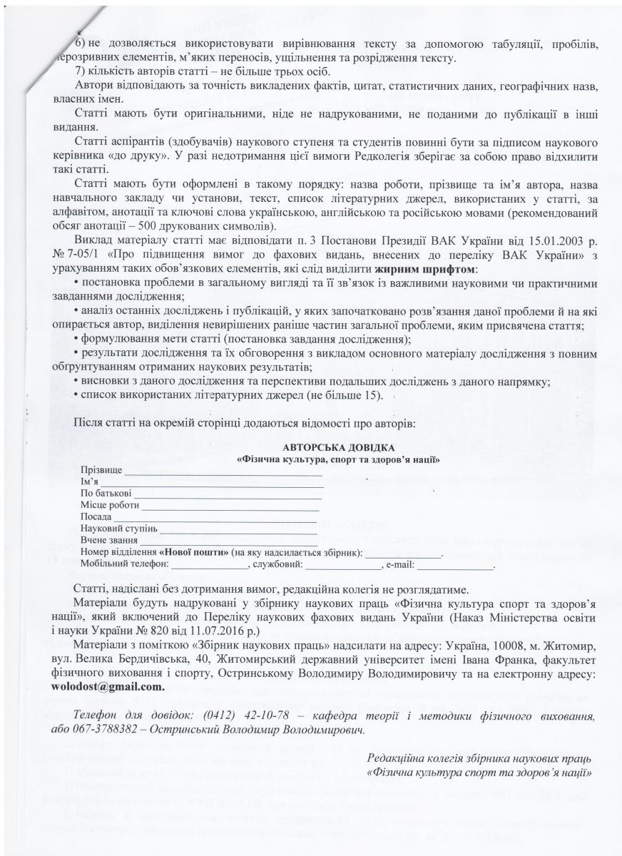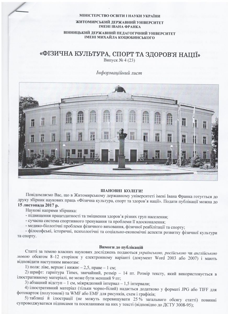 • В Житомирському державному університеті імені Івана Франка готується до друку збірник наукових праць "Фізична культура, спорт та здоров'я нації". Подати публікації можна до 15 листопада 2017 р.