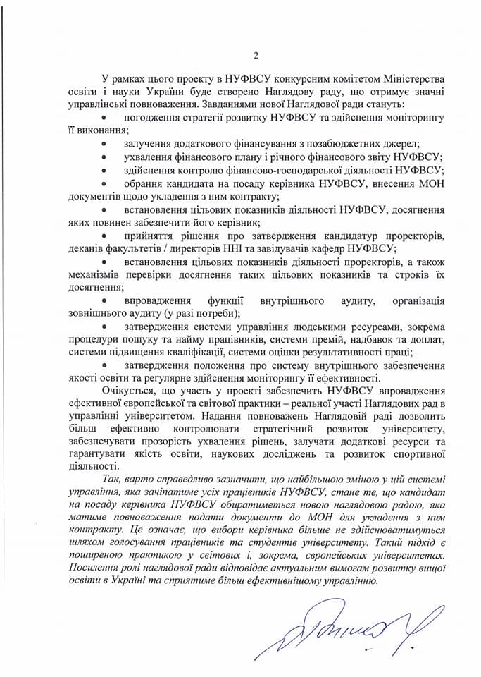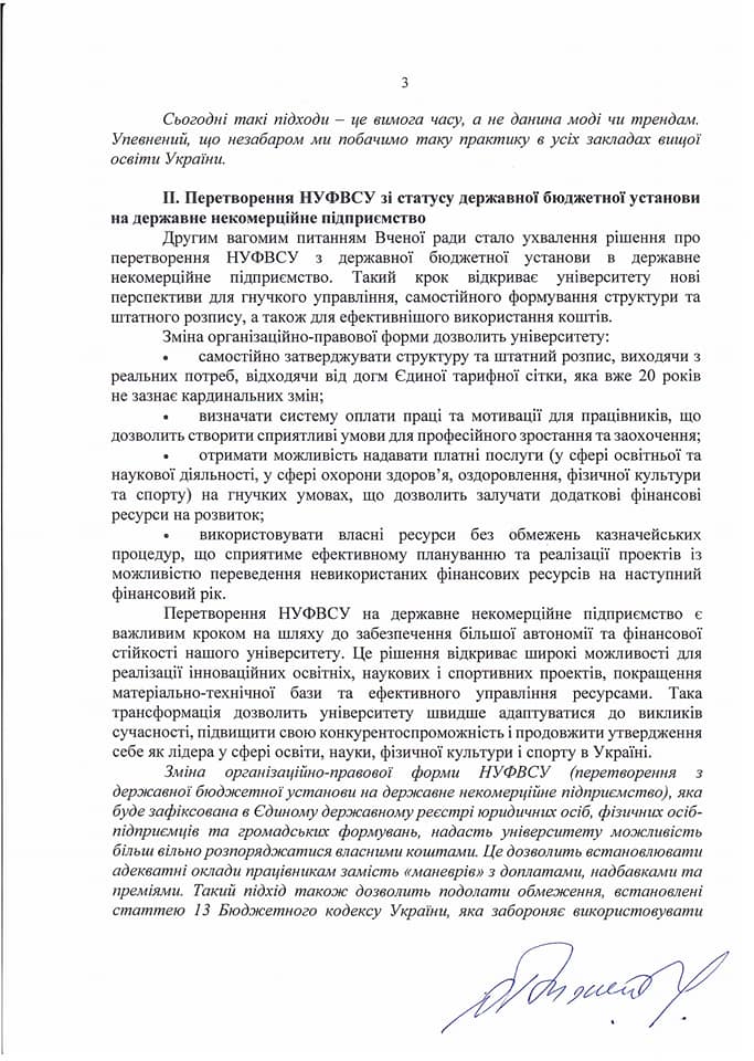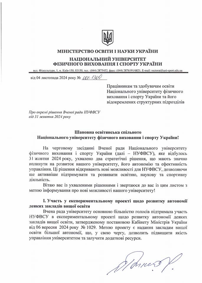 Сьогодні я звернувся до працівників та студентів Національного університету фізичного виховання і спорту України з відкритим листом. Це важливе послання, в якому я детально пояснив всі аспекти останніх рішень Вченої ради університету щодо нашої участі в експериментальному проекті з автономії закладів вищої освіти та перетворення університету на державне некомерційне підприємство.