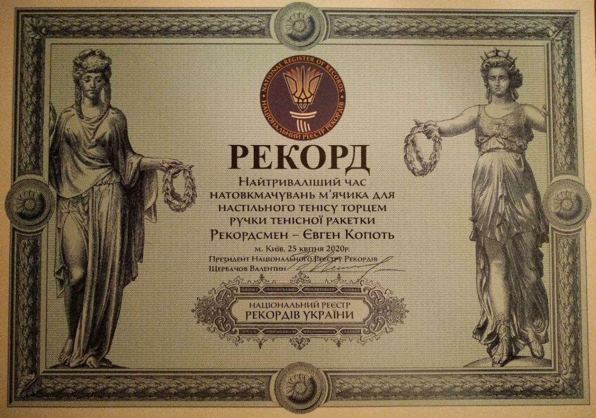 25 квітня 2020 р. Національним реєстром Рекордів України був зареєстрований рекорд України, який встановив студент тренерського факультету, кафедри спортивних ігор, групи 41-СІ1 Копоть Євген: « Найтриваліший час натовкмачувань тенісного м’яча для настільного тенісу торцем ручки тенісної ракетки».