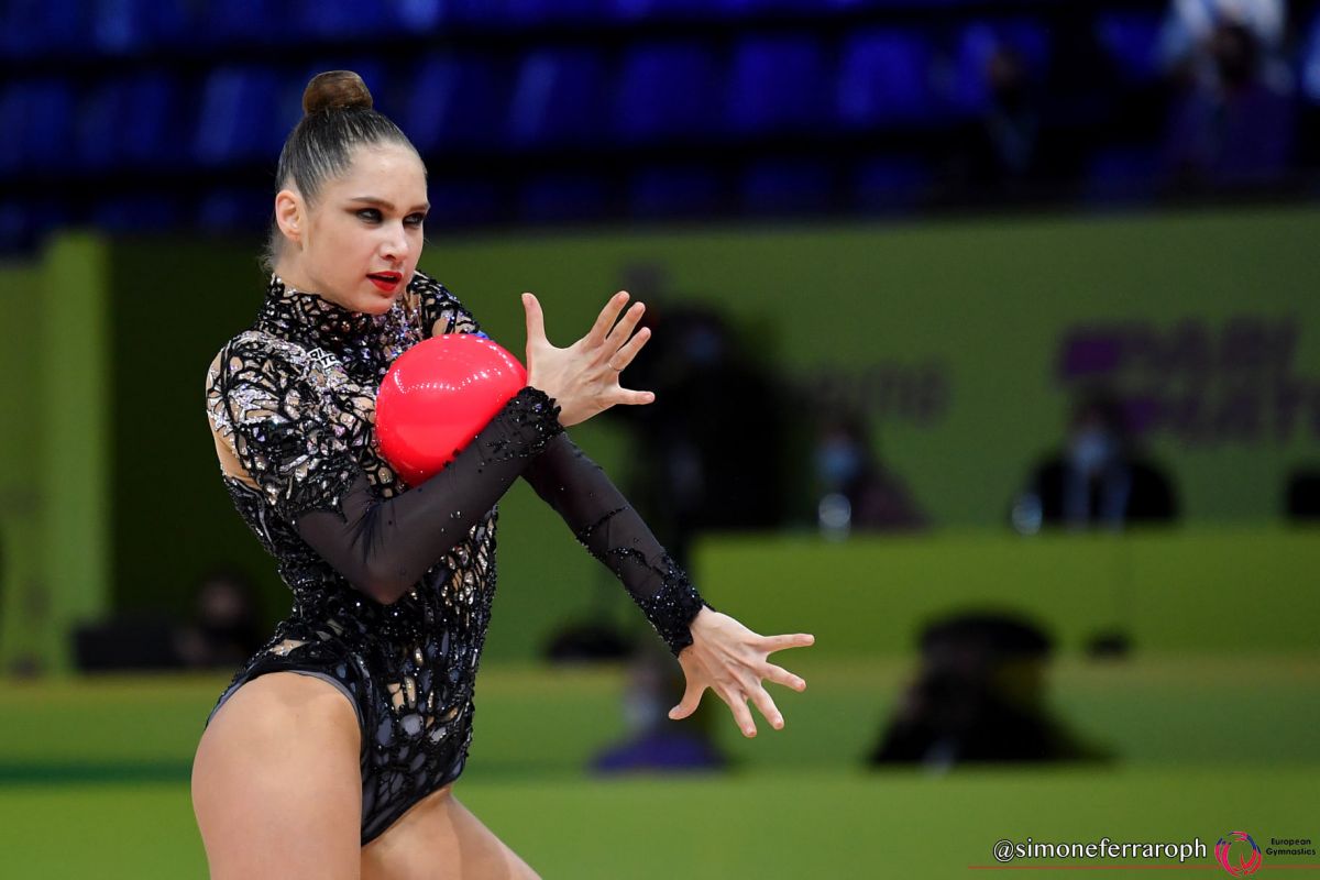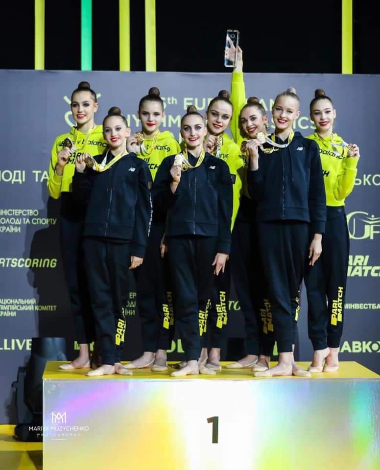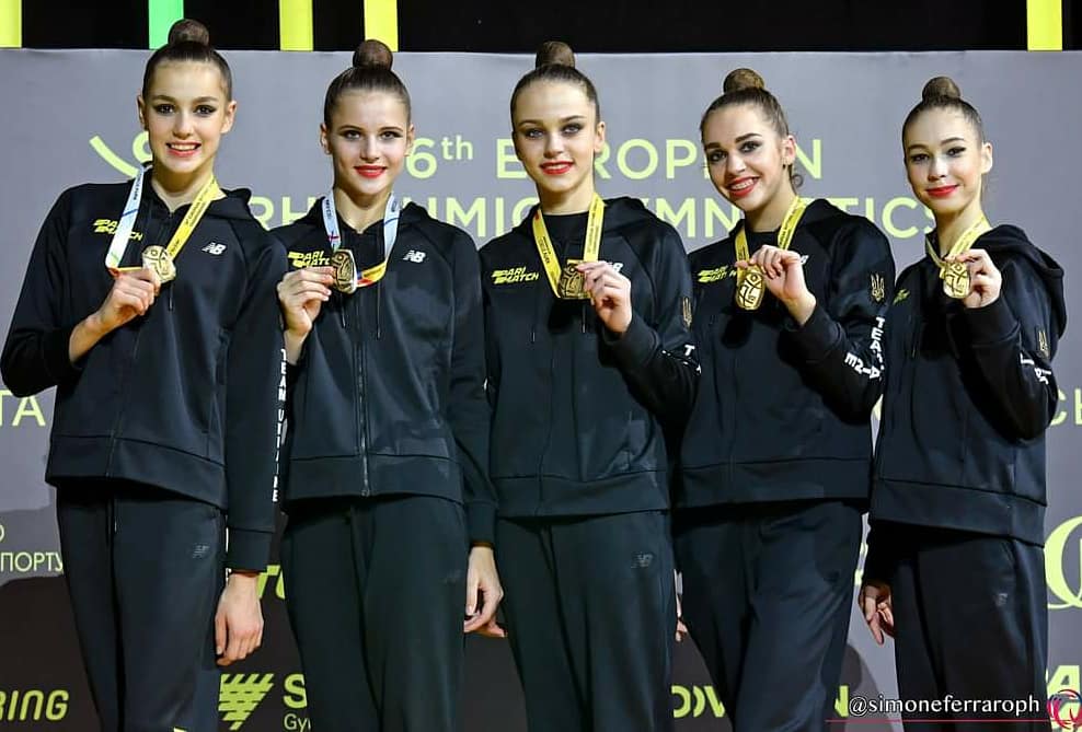 У фіналі змагань наші грації у групових вправах завоювали золото Чемпіонату Європи з 5 м'ячами та срібло у фіналі з обручами/булавами.