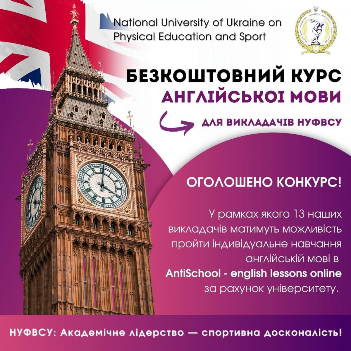 Національний університет фізичного вихїовання і спорту України продовжує підтримувати розвиток наших викладачів! Ми раді оголосити про запуск другого етапу програми з вивчення англійської мови для професорсько-викладацького складу університету.