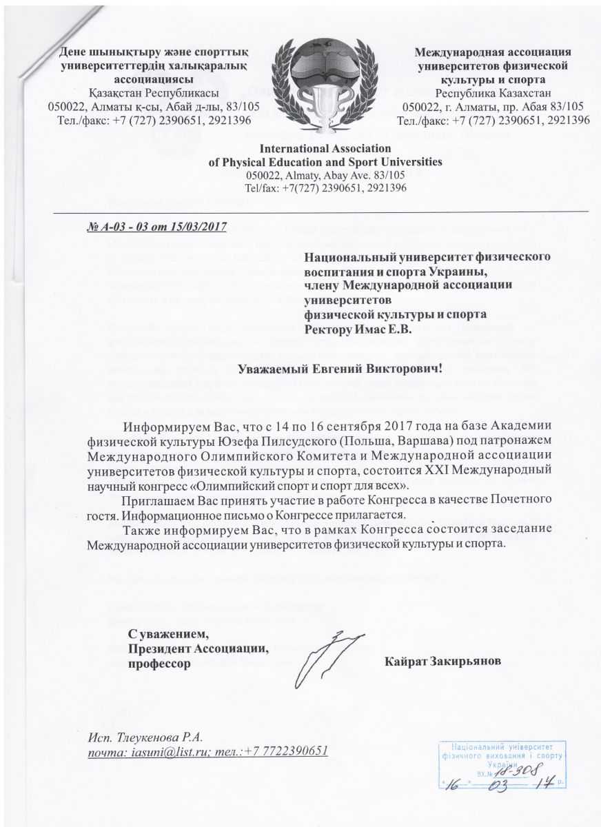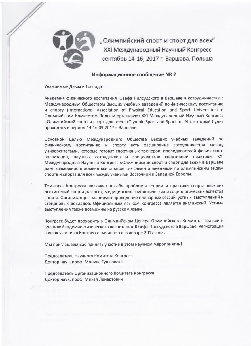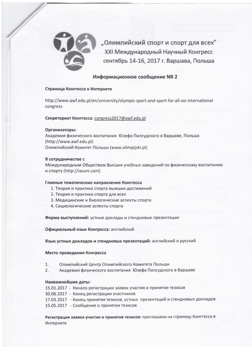Юзеф Пілсудський університет фізичної культури у Варшаві, Міжнародна асоціація фізичної культури і спорту університетів і Польського олімпійського комітету організовує XXI Міжнародний науковий конгрес «Олімпійський спорт і спорт для всіх», який пройде 14-16 вересня 2017 році у Варшаві, Польща.