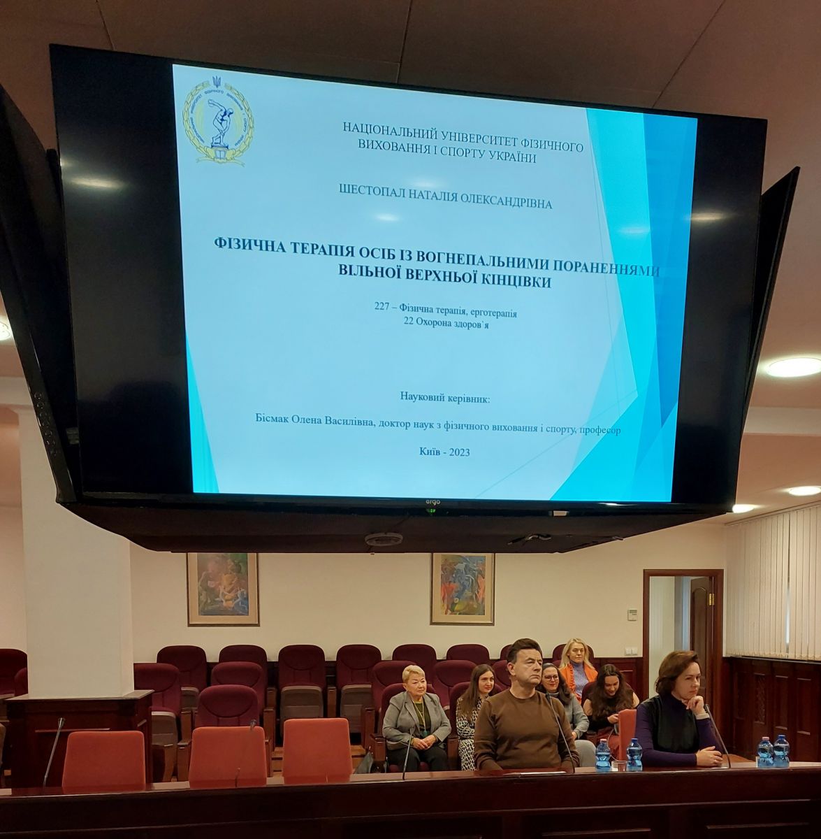 19 грудня 2023 р. на засіданні спеціалізованої вченої ради ДФ 24.227.25 Національного університету фізичного виховання і спорту України відбувся захист дисертаційної роботи Шестопал Наталії Олександрівни на тему: «Фізична терапія осіб із вогнепальними пораненнями вільної верхньої кінцівки», поданої на здобуття ступеня доктора філософії за спеціальністю 227 Фізична терапія, ерготерапія.