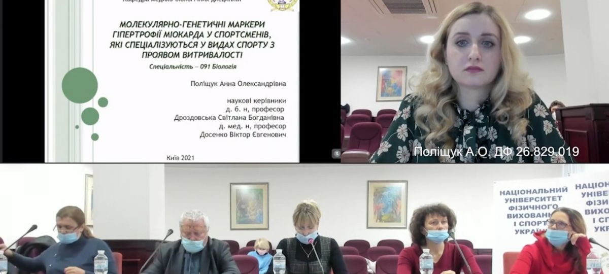 24 грудня 2021 р. на засіданні спеціалізованої вченої ради ДФ 26.829.019 Національного університету фізичного виховання і спорту України відбувся захист дисертаційної роботи Поліщук Анни Олександрівни на тему: «Молекулярно-генетичні маркери гіпертрофії міокарда у спортсменів, які спеціалізуються у видах спорту з проявом витривалості», поданої на здобуття ступеня доктора філософії за спеціальністю 091 Біологія.