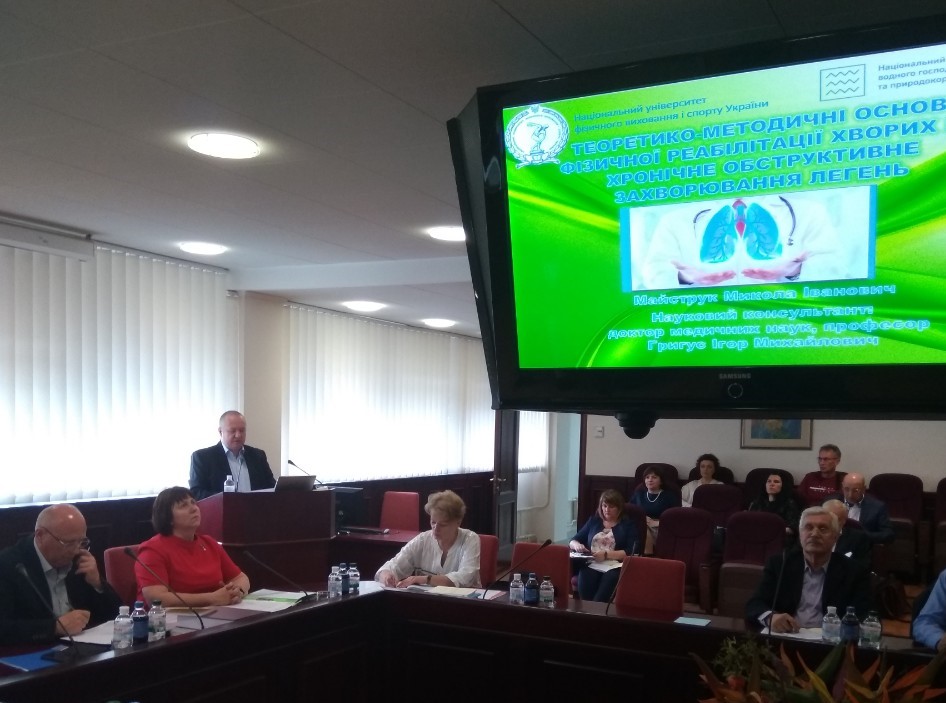 • Майструка Миколи Івановича на тему «Теоретико-методичні основи фізичної реабілітації хворих на хронічне обструктивне захворювання легень», поданої до офіційного захисту на здобуття наукового ступеня доктора наук з фізичного виховання та спорту за спеціальністю 24.00.03 – фізична реабілітація;