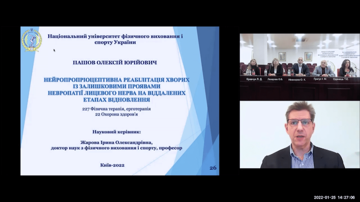 на засіданні спеціалізованої вченої ради ДФ 26.829.031 НУФВСУ відбувся захист дисертаційної роботи Пашова Олексія Юрійовича на тему: «Нейропропріоцептивна реабілітація хворих з залишковими проявами невропатії лицевого нерва на віддалених етапах відновлення», поданої на здобуття ступеня доктора філософії за спеціальністю 227 Фізична терапія, ерготерапія.