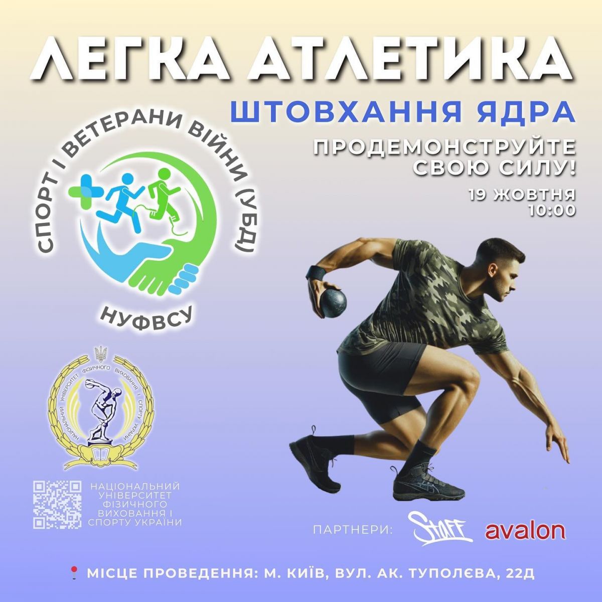 Національний університет фізичного виховання і спорту України продовжує проект «Спорт і ветерани війни (УБД)» і з радістю оголошує про проведення змагань з легкої атлетики (штовхання ядра)!