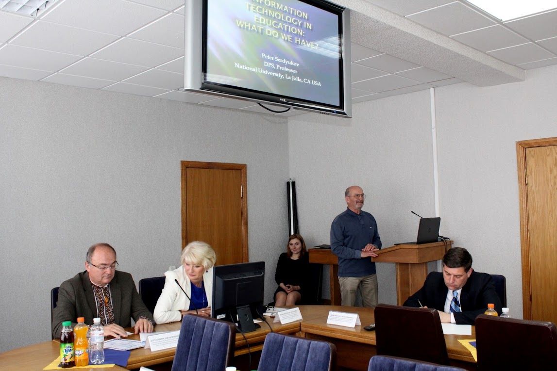 Доктор педагогічних наук, провідний фахівець та вчений у напрямку освітніх технологій, освітнього менеджменту, теорії навчальної програми з Національного університету Сан-Дієго (Каліфорнія,), Джойн інституту Сан-Дієго США Сердюков Петро Ігоревич розглянув сучасні види організації навчання в США, схарактеризував сучасні тенденції в сфері освіти, підходи до організації навчання онлайн. Було обговорено низку актуальних питань щодо особливостей навчання онлайн та способів його застосування у вищих навчальних закладах.