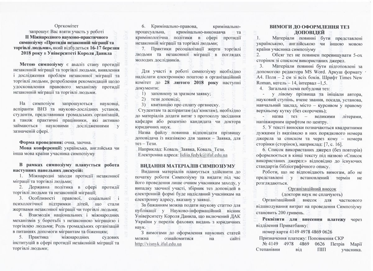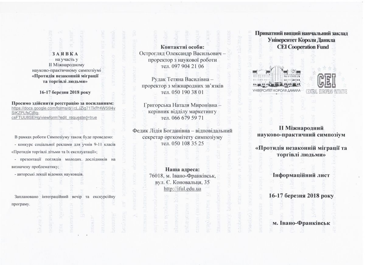 • 16-17 березня 2018 року Приватний вищий навчальний заклад "Університет Короля Данила" (м. Івано-Франківськ) запрошує взяти участь у роботі ІІ Міжнародного науково-практичного симпозіуму "Протидія незаконній міграції та торгівлі людьми"
