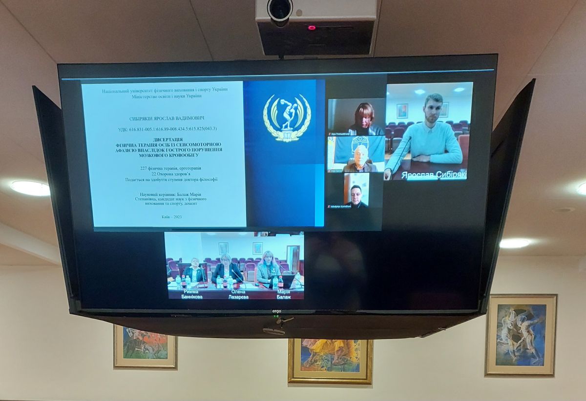 9 січня 2024 р. на засіданні спеціалізованої вченої ради ДФ 24.227.01 Національного університету фізичного виховання і спорту України відбувся захист дисертаційної роботи Сибірякіна Ярослава Вадимовича на тему: «Фізична терапія осіб із сенсомоторною афазією внаслідок гострого порушення мозкового кровообігу», поданої на здобуття ступеня доктора філософії за спеціальністю 227 Фізична терапія, ерготерапія.