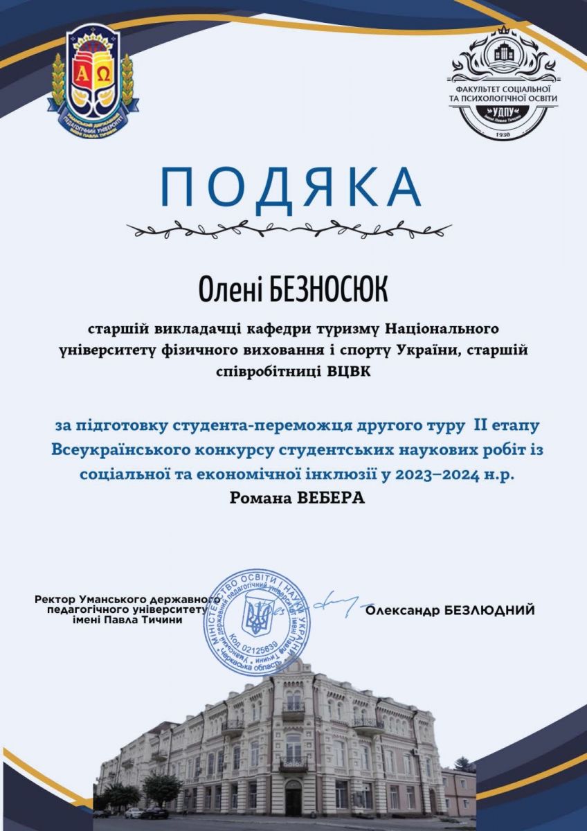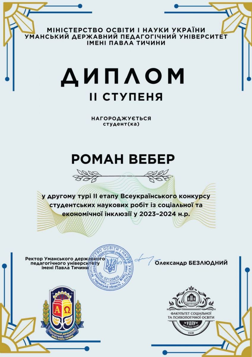 Визначено переможців та призерів Всеукраїнського конкурсу студентських наукових робіт із соціальної та економічної інклюзії, який проходив з лютого по квітень 2024 року на базі Уманського державного педагогічнеого унверситету імені Павла Тичини.