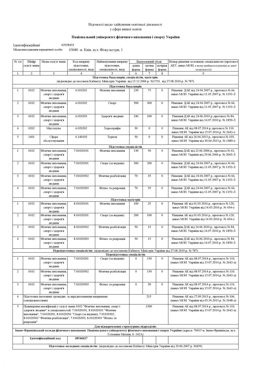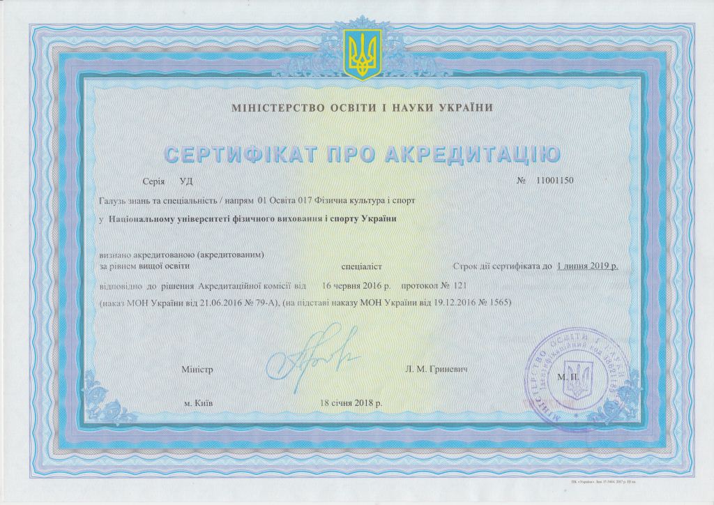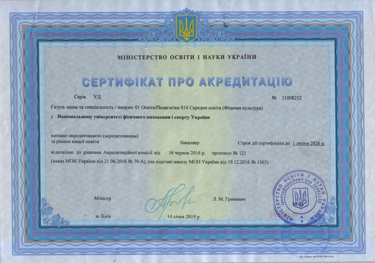 | Speciality: 017 Physical culture and sport Specialization: “Physical Education” “Olympic sport and education” “Sport” “Fitness and recreation” “Management in sport” “Athletes training system in Track and Field Athletics” “Athletes training system in Aquatics” “Athletes training system in martial arts” “Sports training and coaching activities in the Olympic sports” “E-sports” |