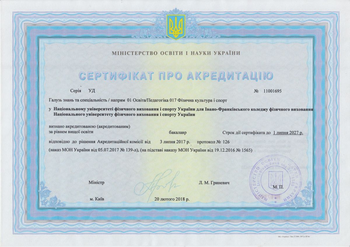 | Speciality: 017 Physical culture and sport Specialization: “Coaching activities in the chosen sport” “Physical education in educational and industrial spheres” “Management in sports activities” “Fitness and recreation” |